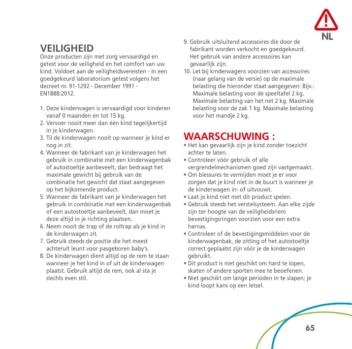 VEILIGHEID Onze producten zijn met zorg vervaardigd en getest voor de veiligheid en het comfort van uw kind. Voldoet aan de veiligheidsvereisten - In een goedgekeurd laboratorium getest volgens het decreet nr. 91-1292 - December 1991 EN1888:2012. 1. Deze kinderwagen is vervaardigd voor kinderen vanaf 0 maanden en tot 15 kg. 2. Vervoer nooit meer dan één kind tegelijkertijd in je kinderwagen. 3. Til de kinderwagen nooit op wanneer je kind er nog in zit. 4. Wanneer de fabrikant van je kinderwagen het gebruik in combinatie met een kinderwagenbak of autostoeltje aanbeveelt, dan bedraagt het maximale gewicht bij gebruik van de combinatie het gewicht dat staat aangegeven op het bijkomende product. 5. Wanneer de fabrikant van je kinderwagen het gebruik in combinatie met een kinderwagenbak of een autostoeltje aanbeveelt, dan moet je deze altijd in je richting plaatsen. 6. Neem nooit de trap of de roltrap als je kind in de kinderwagen zit. 7. Gebruik steeds de positie die het meest achteruit leunt voor pasgeboren baby’s. 8. De kinderwagen dient altijd op de rem te staan wanneer je het kind in of uit de kinderwagen plaatst. Gebruik altijd de rem, ook al sta je slechts even stil.