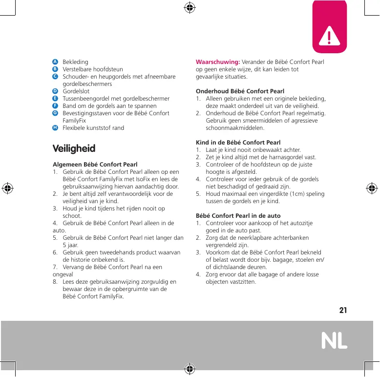 Waarschuwing: Verander de Bébé Confort Pearl op geen enkele wijze, dit kan leiden tot gevaarlijke situaties. Onderhoud Bébé Confort Pearl 1. Alleen gebruiken met een originele bekleding, deze maakt onderdeel uit van de veiligheid. 2. Onderhoud de Bébé Confort Pearl regelmatig. Gebruik geen smeermiddelen of agressieve schoonmaakmiddelen. Kind in de Bébé Confort Pearl 1. Laat je kind nooit onbewaakt achter. 2. Zet je kind altijd met de harnasgordel vast. 3. Controleer of de hoofdsteun op de juiste hoogte is afgesteld. 4. Controleer voor ieder gebruik of de gordels niet beschadigd of gedraaid zijn. 5. Houd maximaal een vingerdikte (1cm) speling tussen de gordels en je kind. Bébé Confort Pearl in de auto 1. Controleer voor aankoop of het autozitje goed in de auto past. 2. Zorg dat de neerklapbare achterbanken vergrendeld zijn. 3. Voorkom dat de Bébé Confort Pearl bekneld of belast wordt door bijv. bagage, stoelen en/ of dichtslaande deuren. 4. Zorg ervoor dat alle bagage of andere losse objecten vastzitten.