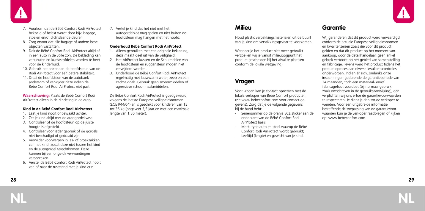 NL Onderhoud Bébé Confort Rodi AirProtect 1. Alleen gebruiken met een originele bekleding, deze maakt deel uit van de veiligheid. 2. Het AirProtect kussen en de Schuimdelen van de hoofdsteun en ruggensteun mogen niet verwijderd worden. 3. Onderhoud de Bébé Confort Rodi AirProtect regelmatig met lauwwarm water, zeep en een zachte doek. Gebruik geen smeermiddelen of agressieve schoonmaakmiddelen.