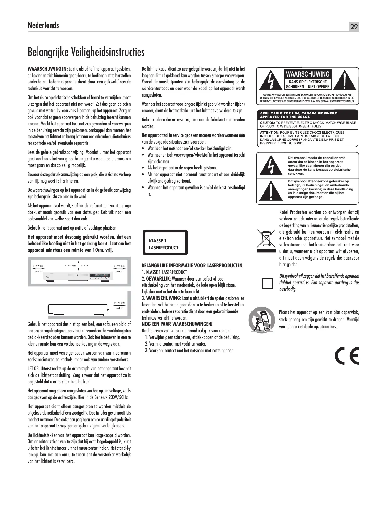 Dit symbool maakt de gebruiker erop attent dat er binnen in het apparaat gevaarlijke spanningen zijn en dat daardoor de kans bestaat op elektrische schokken. Dit symbool attendeert de gebruiker op belangrijke bedienings- en onderhoudsaanwijzingen (service) in deze handleiding en in overige documenten die bij het apparaat zijn gevoegd. Rotel Producten worden zo ontworpen dat zij voldoen aan de internationale regels betreffende de beperking van milieuonvriendelijke grondstoffen, die gebruikt kunnen worden in elektrische en elektronische apparatuur. Het symbool met de vuilcontainer met het kruis erdoor betekent voor u dat u, wanneer u dit apparaat wilt afvoeren, dit moet doen volgens de regels die daarvoor hier gelden. Dit symbool wil zeggen dat het betreffende apparaat dubbel geaard is. Een separate aarding is dus overbodig. Plaats het apparaat op een vast plat oppervlak, sterk genoeg om zijn gewicht te dragen. Vermijd verrijdbare instabiele opzetmeubels. RCD-06 SE CD-speler