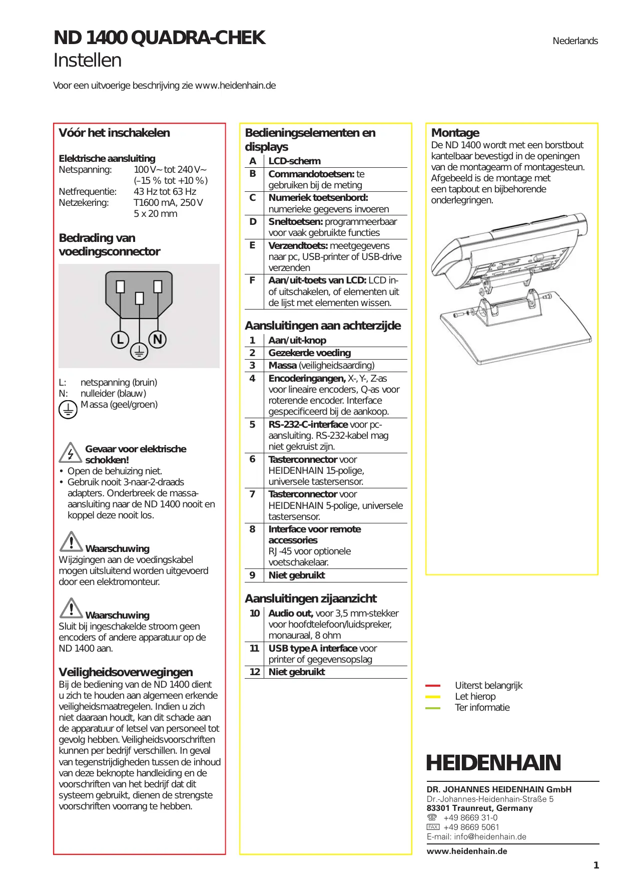 Aan/uit-knop Gezekerde voeding Massa (veiligheidsaarding) Encoderingangen, X-, Y-, Z-as voor lineaire encoders, Q-as voor roterende encoder. Interface gespecificeerd bij de aankoop. RS-232-C-interface voor pcaansluiting. RS-232-kabel mag niet gekruist zijn. Tasterconnector voor HEIDENHAIN 15-polige, universele tastersensor. Tasterconnector voor HEIDENHAIN 5-polige, universele tastersensor. Interface voor remote accessories RJ-45 voor optionele voetschakelaar. Niet gebruikt Aansluitingen zijaanzicht Waarschuwing Sluit bij ingeschakelde stroom geen encoders of andere apparatuur op de ND 1400 aan. Veiligheidsoverwegingen Bij de bediening van de ND 1400 dient u zich te houden aan algemeen erkende veiligheidsmaatregelen. Indien u zich niet daaraan houdt, kan dit schade aan de apparatuur of letsel van personeel tot gevolg hebben. Veiligheidsvoorschriften kunnen per bedrijf verschillen. In geval van tegenstrijdigheden tussen de inhoud van deze beknopte handleiding en de voorschriften van het bedrijf dat dit systeem gebruikt, dienen de strengste voorschriften voorrang te hebben.