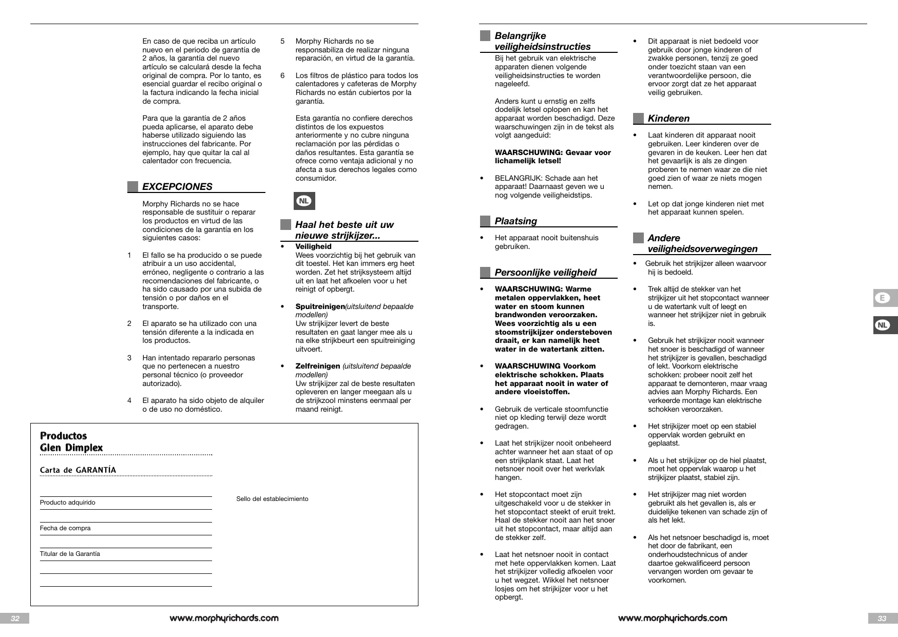 Pour la clientèle en Belgique Les produits de Morphy Richards sont produits conformément les normes de qualité, agrée international. Au-dessus vos droits légaux, Morphy Richards vous garantit qu’à partir d’achat ce produit sera sans défauts de fabrication ou de matériels pendant une période de deux ans.