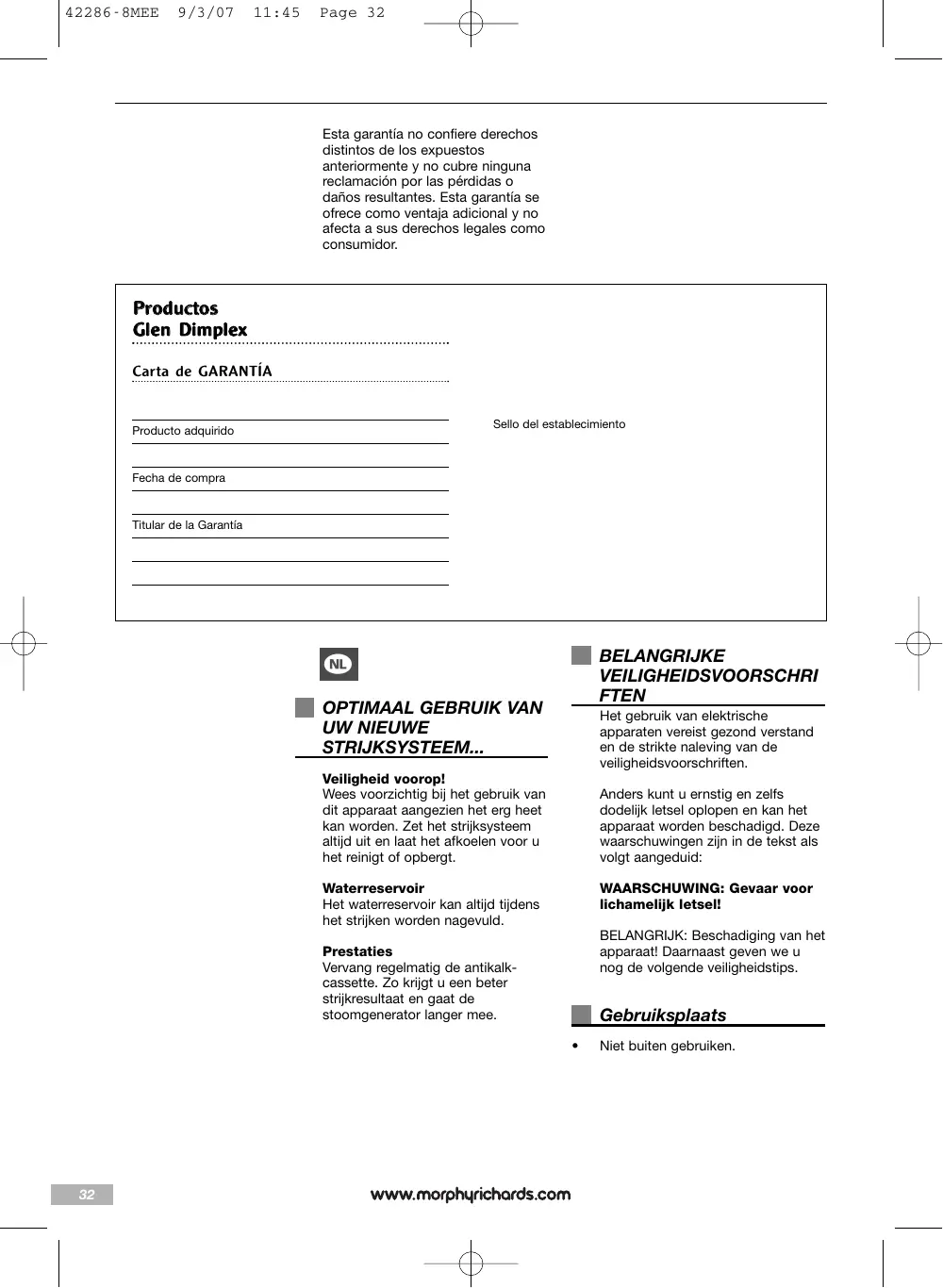 Les produits de Morphy Richards sont produits conformément les normes de qualité, agrée international. Au-dessus vos droits légaux, Morphy Richards vous garantit qu’à partir d’achat ce produit sera sans défauts de fabrication ou de matériels pendant une période de deux ans. Il est important de conserver votre bon d’achat comme preuve. Agrafez votre ticket à cette notice d’installation. Veuillez mentionner ces informations ci-dessous si votre appareil tombe en panne. Vous trouverez ces informations sur la base de l’appareil. Numéro du modèle Numéro de série Si, pour quelque raison que ce soit, l’article est remplacé pendant la période de garantie (deux ans), la période de garantie du nouvel article sera calculée à partir de la date d’achat d’origine. Il est donc très importants de conserver votre bon d’achat original afin de connaître la date initiale d’achat. Cette garantie vaut uniquement quand l’appareil a été utilisé conformément aux instructions du fabricant. Par exemple, les appareils doivent être détartrés et les filtres doivent être tenus propre selon le mode d’emploi.