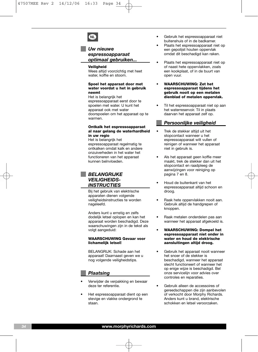 GEBRUIKSAANWIJZING PUMP ESPRESSO COFFEE MAKER 47507 MORPHY RICHARDS