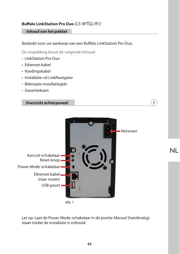 Buffalo LinkStation Pro Duo (LS-WTGL/R1) Inhoud van het pakket Bedankt voor uw aankoop van een Buffalo LinkStation Pro Duo. De verpakking bevat de volgende inhoud: • LinkStation Pro Duo • Ethernet-kabel • Voedingskabel • Installatie-cd LinkNavigator • Beknopte installatiegids • Garantiekaart Overzicht achterpaneel