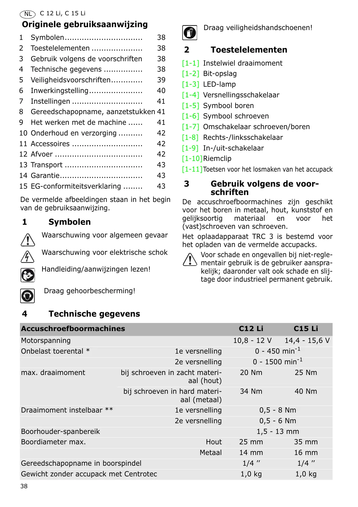 Gebruik volgens de voorschriften De accuschroefboormachines zijn geschikt voor het boren in metaal, hout, kunststof en gelijksoortig materiaal voor het (vast)schroeven van schroeven. Het oplaadapparaat TRC 3 is bestemd voor het opladen van de vermelde accupacks. Voor schade en ongevallen bij niet-reglementair gebruik is de gebruiker aansprakelijk; daaronder valt ook schade en slijtage door industrieel permanent gebruik. Draag gehoorbescherming!