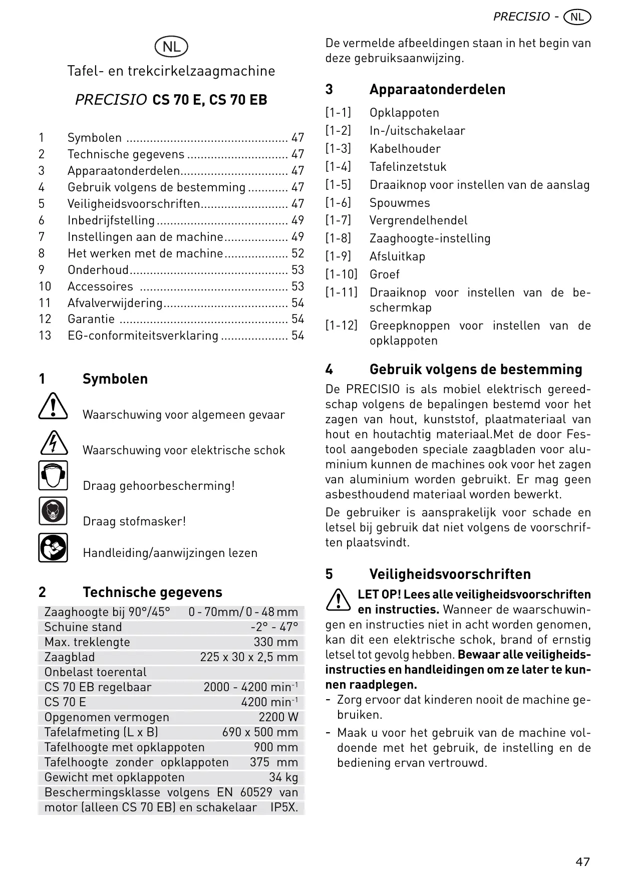 Technische gegevens Zaaghoogte bij 90°/45° 0 - 70mm/ 0 - 48 mm Schuine stand -2° - 47° Max. treklengte 330 mm Zaagblad 225 x 30 x 2,5 mm Onbelast toerental CS 70 EB regelbaar 2000 - 4200 min-1 CS 70 E 4200 min-1 Opgenomen vermogen 2200 W Tafelafmeting (L x B) 690 x 500 mm Tafelhoogte met opklappoten 900 mm Tafelhoogte zonder opklappoten 375 mm Gewicht met opklappoten 34 kg Beschermingsklasse volgens EN 60529 van motor (alleen CS 70 EB) en schakelaar IP5X. Gebruik volgens de bestemming De PRECISIO is als mobiel elektrisch gereedschap volgens de bepalingen bestemd voor het zagen van hout, kunststof, plaatmateriaal van hout en houtachtig materiaal.Met de door Festool aangeboden speciale zaagbladen voor aluminium kunnen de machines ook voor het zagen van aluminium worden gebruikt. Er mag geen asbesthoudend materiaal worden bewerkt. De gebruiker is aansprakelijk voor schade en letsel bij gebruik dat niet volgens de voorschriften plaatsvindt.