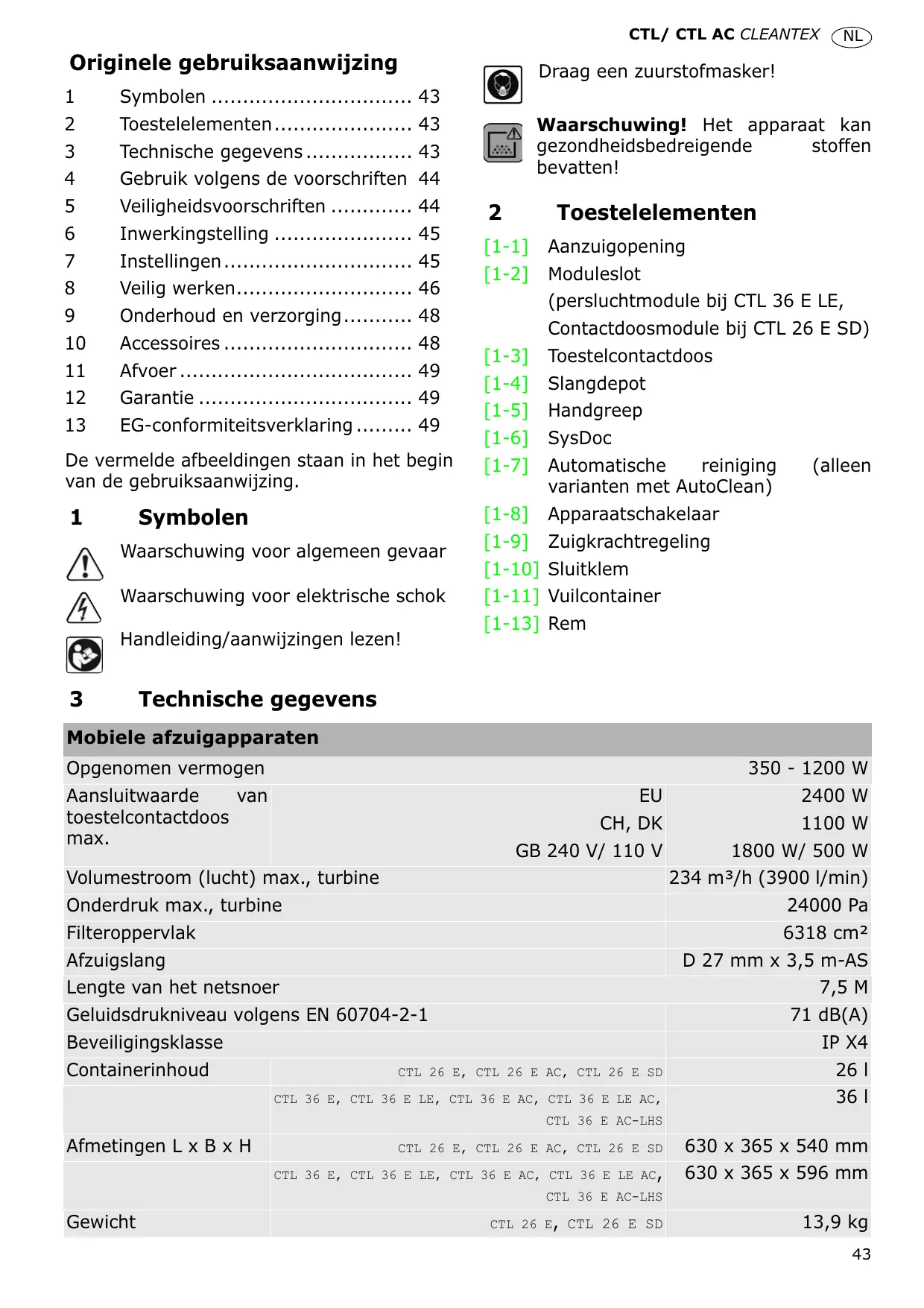 CTL 36 E, CTL 36 E LE 14,4 kg CTL 26 E AC 14,7 kg 15,2 kg met een geschikte veiligheidsuitrusting. Gebruik het apparaat uitsluitend met een volledig geïnstalleerd filtersysteem. Bij het omgaan met en afzuigen van stoffen die gevaarlijk zijn voor de gezondheid die- nen onvoorwaardelijk de veiligheidsvoor- schriften die in uw land van toepassing zijn en de informatie van de producent van het materiaal in acht te worden genomen. Bij gebruik als ontstoffer mag bij het afzui- gen van stoffen die de grenswaarden over- schrijden of bij een aanzienlijke hoeveelheid eiken- en beukenhoutstof slechts één enkele stofbron (elektrisch of persluchtgereedschap) afgezogen worden. Explosie- en brandgevaar: Geen vonken of hete stoffen opzuigen, geen brandbare of explosieve stoffen opzuigen (bijv. magne- sium, aluminium, met uitzondering van hout), geen brandbare en explosieve vloei- stoffen opzuigen (bijv. benzine, verdun- middel), geen agressieve vloeistoffen/ vaste stoffen opzuigen (bijv. zuren, logen, oplosmiddelen). Deze mobiele stofafzuiger is geschikt voor het zuigen van lakstof. Het apparaat in een voldoende geventileerde ruimte gebruiken (nationale voorschriften inzake de bescherming van de werknemer in acht nemen). De aansluitkabel niet beschadigen (bijv. door erover heen te rijden, eraan te rukken, .…). Beschermen tegen hitte, olie en scherpe randen. De stekker niet aan het snoer uit het stopcontact trekken. Controleer regelmatig de stekker en het snoer en laat deze bij beschadiging door een geautoriseerde klantenservicewerkplaats vervangen. De aansluitkabel alleen vervan- gen door een type dat in de onderdelenlijst is aangegeven. Het apparaat niet blootstellen aan regen. Het apparaat mag alleen worden gebruikt door personen die geïnstrueerd zijn over de bediening en belast zijn met het gebruik er- van. De bediener van het apparaat dient véér het gebruik geïnstrueerd te worden over de om- gang met het apparaat, de stoffen waarvoor