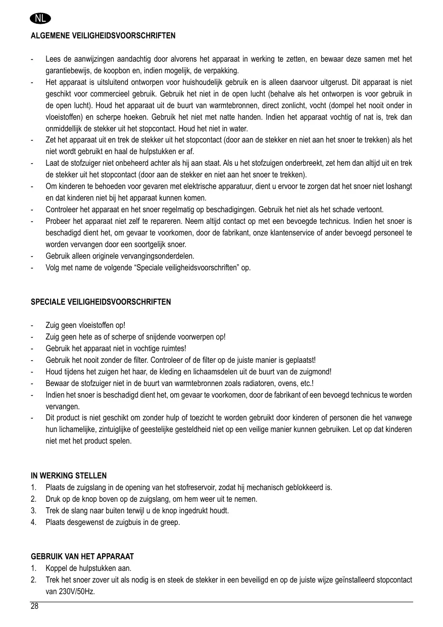 - Houdijdens het zuigen het haar, de kleding en lichaamsdelen uit de buurt van de zuigmond!