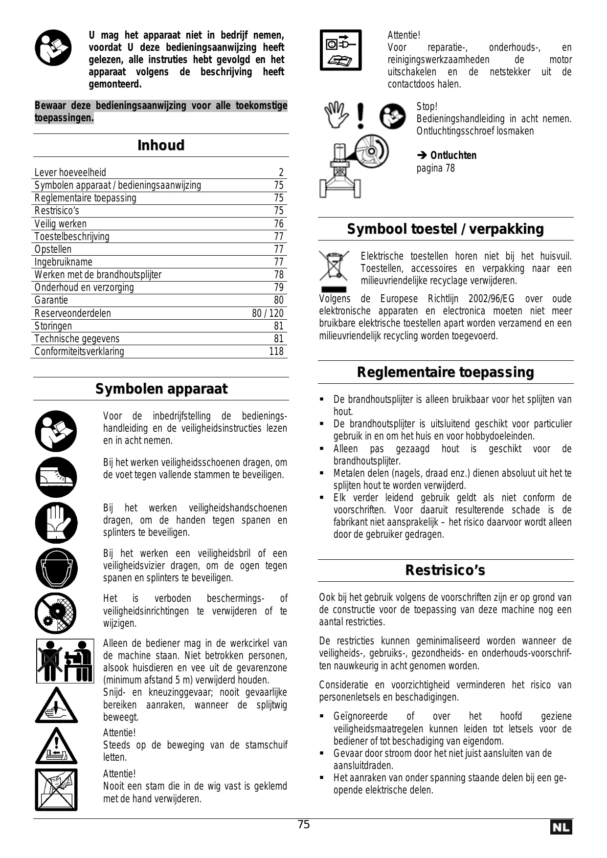 U mag het apparaat niet in bedrijf nemen, voordat U deze bedieningsaanwijzing heeft gelezen, alle instruties hebt gevolgd en het apparaat volgens de beschrijving heeft gemonteerd. Attentie! Voor reparatie-, onderhouds-, reinigingswerkzaamheden motor uitschakelen en de netstekker uit de contactdoos halen. Bewaar deze bedieningsaanwijzing voor alle toekomstige toepassingen. Stop! Bedieningshandleiding in acht nemen. Ontluchtingsschroef losmaken Inhoud Lever hoeveelheid Symbolen apparaat / bedieningsaanwijzing Reglementaire toepassing Restrisico’s Veilig werken Toestelbeschrijving Opstellen Ingebruikname Werken met de brandhoutsplijter Onderhoud en verzorging Garantie Reserveonderdelen Storingen Technische gegevens Conformiteitsverklaring Î Ontluchten pagina 78