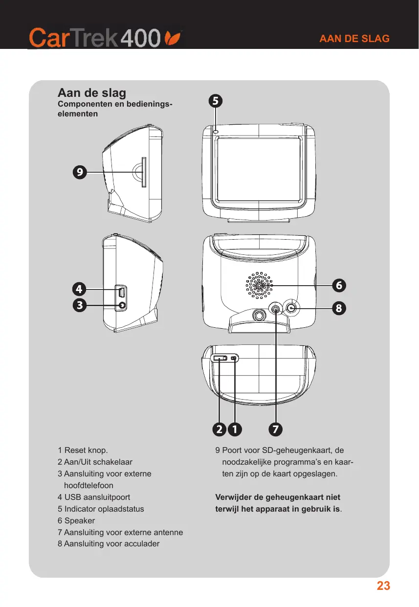 Aan de slag Componenten en bedieningselementen 1 Reset knop. 2 Aan/Uit schakelaar 3 Aansluiting voor externe hoofdtelefoon 4 USB aansluitpoort 5 Indicator oplaadstatus 6 Speaker 7 Aansluiting voor externe antenne 8 Aansluiting voor acculader 9 Poort voor SD-geheugenkaart, de noodzakelijke programma’s en kaarten zijn op de kaart opgeslagen. Verwijder de geheugenkaart niet terwijl het apparaat in gebruik is.