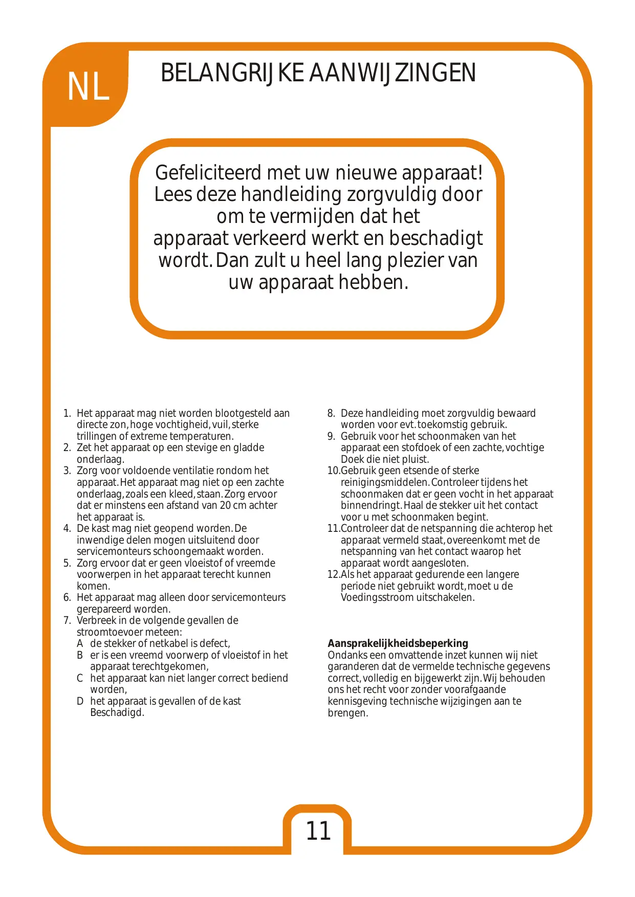 BELANGRIJKE AANWIJZINGEN Gefeliciteerd met uw nieuwe apparaat! Lees deze handleiding zorgvuldig door om te vermijden dat het apparaat verkeerd werkt en beschadigt wordt. Dan zult u heel lang plezier van uw apparaat hebben.