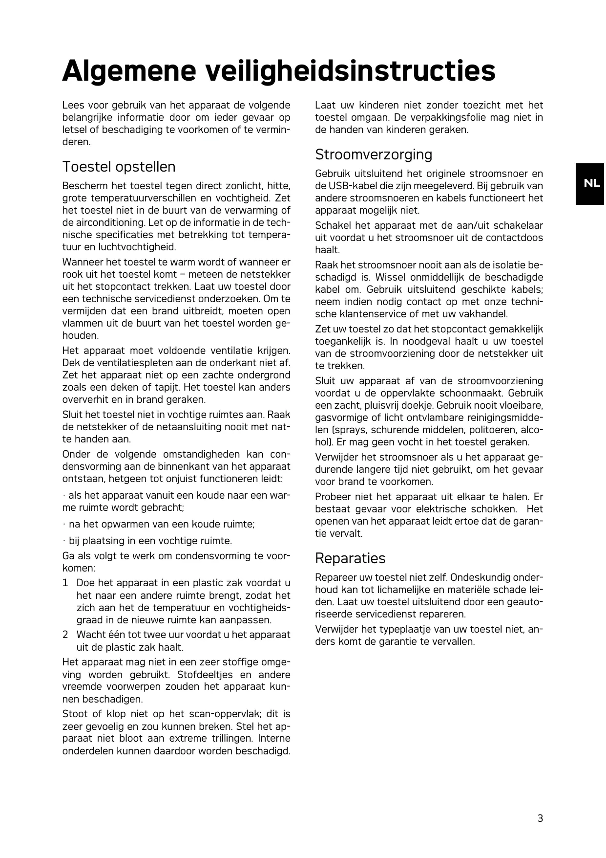 - bij plaatsing in een vochtige ruimte. Ga als volgt te werk om condensvorming te voorkomen: 1 Doe het apparaat in een plastic zak voordat u het naar een andere ruimte brengt, zodat het zich aan het de temperatuur en vochtigheidsgraad in de nieuwe ruimte kan aanpassen. 2 Wacht één tot twee uur voordat u het apparaat uit de plastic zak haalt. Verwijder het stroomsnoer als u het apparaat gedurende langere tijd niet gebruikt, om het gevaar voor brand te voorkomen. Reparaties Reparaties Repareer uw toestel niet zelf. Ondeskundig onderhoud kan tot lichamelijke en materiële schade leiden. Laat uw toestel uitsluitend door een geautoriseerde servicedienst repareren. Verwijder het typeplaatje van uw toestel niet, anders komt de garantie te vervallen. Het apparaat mag niet in een zeer stoffige omgeving worden gebruikt. Het apparaat mag niet in een zeer stoffige omgeving worden gebruikt. Stofdeeltjes en andere vreemde voorwerpen zouden het apparaat kunnen beschadigen. Stoot of klop niet op het scan-oppervlak; dit is zeer gevoelig en zou kunnen breken. Stel het apparaat niet bloot aan extreme trillingen. Interne onderdelen kunnen daardoor worden beschadigd.