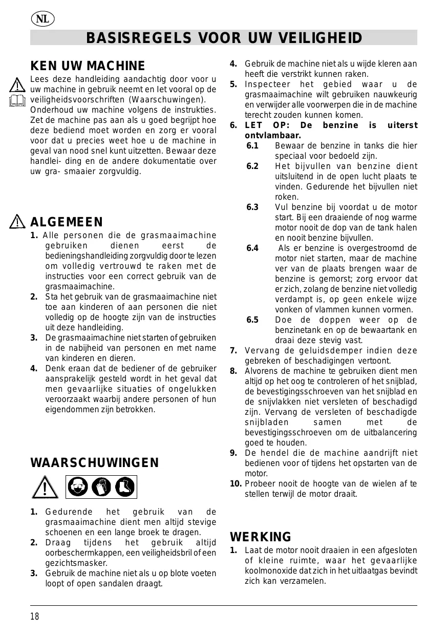 NL BASISREGELS VOOR UW VEILIGHEID KEN UW MACHINE Lees deze handleiding aandachtig door voor u uw machine in gebruik neemt en Iet vooral op de veiligheidsvoorschriften (Waarschuwingen). Onderhoud uw machine volgens de instrukties. Zet de machine pas aan als u goed begrijpt hoe deze bediend moet worden en zorg er vooral voor dat u precies weet hoe u de machine in geval van nood snel kunt uitzetten. Bewaar deze handlei- ding en de andere dokumentatie over uw gra- smaaier zorgvuldig.