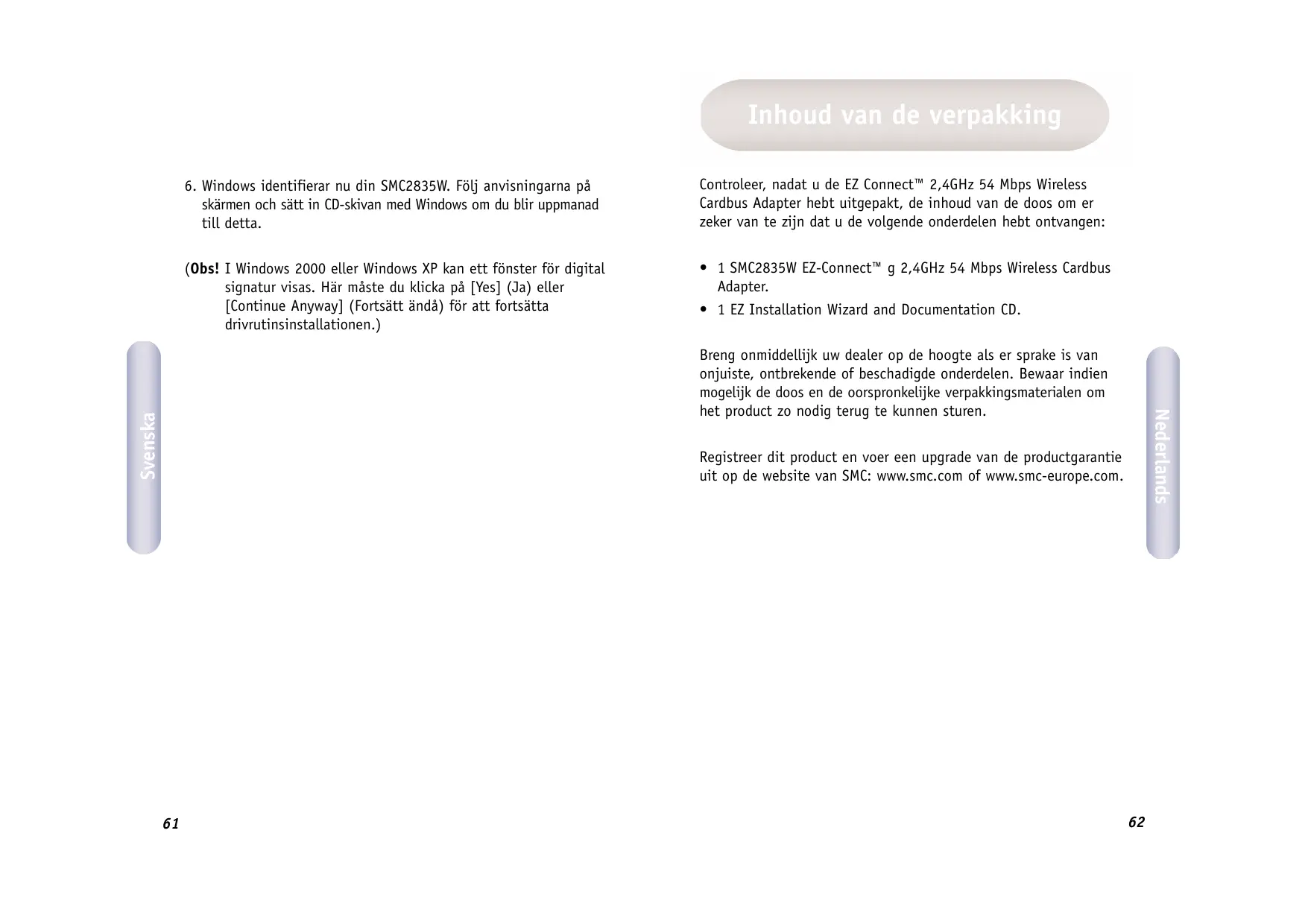 skärmen och sätt in CD-skivan med Windows om du blir uppmanad till detta. (Obs! I Windows 2000 eller Windows XP kan ett fünster für digital signatur visas. Här mäste du klicka pà [Yes] (Ja) eller [Continue Anyway] (Fortsätt ändä) fôr att fortsätta drivrutinsinstallationen.) Controleer, nadat u de EZ Connect" 2,4GHz 54 Mbps Wireless Cardbus Adapter hebt uitgepakt, de inhoud van de doos om er zeker van te zijn dat u de volgende onderdelen hebt ontvangen: + 1 SMC2835W EZ-Connect" g 2,4GHz 54 Mbps Wireless Cardbus Adapter. + 1EZ Installation Wizard and Documentation CD. Breng onmiddellijk uw dealer op de hoogte als er sprake is van onjuiste, ontbrekende of beschadigde onderdelen. Bewaar indien mogelijk de doos en de oorspronkelijke verpakkingsmaterialen om het product zo nodig terug te kunnen sturen. Registreer dit product en voer een upgrade van de productgarantie uit op de website van SMC: www.smc.com of www.smc-europe.com.