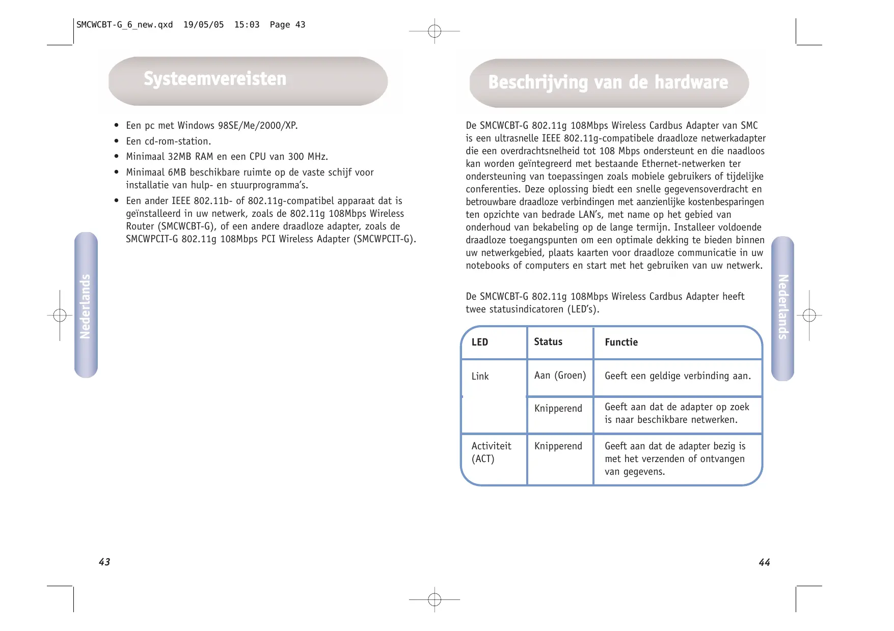 De SMCWCBT-G 802.11g 108Mbps Wireless Cardbus Adapter van SMC is een ultrasnelle IEEE 802.11g-compatibele draadloze netwerkadapter die een overdrachtsnelheid tot 108 Mbps ondersteunt en die naadloos kan worden geïntegreerd met bestaande Ethernet-netwerken ter ondersteuning van toepassingen zoals mobiele gebruikers of tijdelijke conferenties. Deze oplossing biedt een snelle gegevensoverdracht en betrouwbare draadloze verbindingen met aanzienlijke kostenbesparingen ten opzichte van bedrade LAN's, met name op het gebied van onderhoud van bekabeling op de Lange termijn. Installeer voldoende draadloze toegangspunten om een optimale dekking te bieden binnen uw netwerkgebied, plaats kaarten voor draadloze communicatie in uw notebooks of computers en start met het gebruiken van uw netwerk. De SMCWCBT-G 802.11g 108Mbps Wireless Cardbus Adapter heeft twee statusindicatoren (LED's). Functie à fie D Status Link Aan (Groen) | Geeft een geldige verbinding aan. Knipperend Geeft aan dat de adapter op zoek is naar beschikbare netwerken. Activiteit Knipperend Geeft aan dat de adapter bezig is (ACT) met het verzenden of ontvangen NE van gegevens.