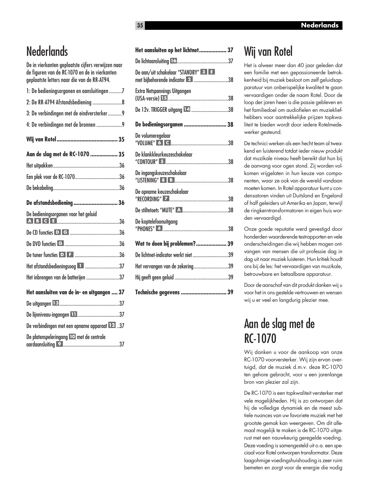 De indicator brandt wel, maar u hoog nog steeds niets. Controller dan of de verbindingCUSSEN de bron en de RC-1070 wel o.k.is.Contrler of de schakelaar "LISTENING" in dejuiste stand staat. Staat eventuel de stiltoeots "MUTE" aan? Hoe is de kwaliteit van de luid-sprekerkabels aan de eindversterker en staatdeze wel aan? Na al deze controles要去ie het doeen. Zo Niet: u weet uw steun en toeverlaat, uw Rotel leverancier, te vinden.