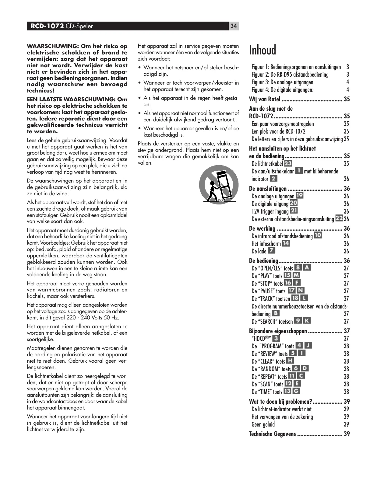 RCD-1072 CD-Speler 34 WAARSCHUWING: Om het risico op elektrische schokken of brand te vermijden: zorg dat het apparaat niet nat wordt. Verwijder de kast niet: er bevinden zich in het appa- raat geen bedieningsorganen. Indien nodig Waarschuw een bevoegd technicus! EEN LAATSTE WAARSCHUWING: Om het risico op elektrische schokken te voorkoment laat het apparaat geslo- ten. ledere reparatie dient door een gekwalificeerde technicus verricht te worden. Lees de gehele gebruiksaanwijzing. Voordat u met het apparaat gaat werken is het van groot belang dat u weet hoe u ermee om moet gaan en dat 0 veilig mogelijk. Bewaar deze gebruiksaanwijzing op een plek, die u zich na verloop van fijd nog weet te herinneren. De waarschuwingen op het apparaat en in de gebruiksaanwijzing zijn belangriik, sla ze niet in de wind. Als het apparaat vuil word, stof het dan af met een zachte droge doek, of maak gebruik van een stofzuiger. Gebruik nooit een oplosmiddel van welke soort dan ook. Het apparaat most dusdanig gebruikt worden, dat een behoorljke koeling niet in het gedrang komt. Voorbeeldies: Gebruik het apparaat niet op: bed, sofa, plaid of andere onregelmatige oppervlakken, waardoor de ventilatiegaten geblokkeerd zouden kunnen worden. Ook het inbouwen in een te kleine ruimte kan een voldoende koeling in de weg staan. Het apparaat moet verre gehouden worden van warmtebronnen zoals: radiatoren en kachels, maar ook versterkers. Het apparaat mag alleen aangesloten worden op het voltage zoals aangegeven op de achter- kant, in dit geval 220 - 240 Volts 50 Hz. Het apparaat dient alleen aangesloten te worden met de bijgeleverde netkabel, of een soortgelike. Maatregelen dienen genomen te worden die de aarding en polarisatie van het apparaat niet te niet doen. Gebruik vooral geen ver- lengsnoeren. De lichinetkabel dient zo neergelegd te wor- den, dat er niet op getrapt Gf door scherpe voorwerpen geklemd kan worden. Vooral de aansluitpunten ziin belangrik: de aansluiting in de wandcontactdoos en daar waar de kabel het apparaat binnengaat. Wanneer het apparaat voor langere tijd niet in gebruik is, dient de lichinetkabel uit het lichinet verwiiderd te zijn. Het apparaat zal in service gegeven moeten worden wanneer één van de volgende situaties zich voordoet: Wanneer het netsnoer en/of steker besch- adigd zijn. Wanneer er toch voorwerpen/vloeistof in het apparaat terecht ziin gekomen. Als het apparaat in de regen heelt gesta- an. Als het apparaat niet normaal functioneert of een duidelik afwikend gedrag vertoont.. Wanneer het apparaat gevallen is en/of de Kast beschadigd is. Plaats de versterker op een vaste, vlakke en stevige ondergrond, Plaats hem niet op een verrifdbare wagen die gemakkelik om kan vallen. Inhoud Figuur 1: Bedieningsorganen en aansluitingen 3 Figuur 2: De RR-D95 afstandsbediening 3 Figuur 3: De analoge uitgangen 4 Figuur 4: De digitale vitgangen: 4 Wij van Rotel Aan de slag met de RCD-1072.... . Een paar voorzorgsmaatregelen 35 Een plek voor de RCD-1072 35 De letters en cifers in deze gebruiksaanwijzing 35 Het aansluiten op het lichtnet en de bediening De lichtnetkabel FE] 35 De aan/uitschakelaar EM met bibehorende indicator EX 36 De aansluitinge: De analoge vitgangen 36 De digitale uitgang EL] 36 TV Trigger ingong EU 36 De externe afstandsbedie-ningsaansluiting 2136 De werking . De infrarood afstandsbediening LL] 36 Het infoscherm LA 36 De lade Ed De bediening..… «3 De “OPEN/CLS" toets EX EN 37 De “PLAY” toets LEIEI 37 De "STOP” toets LEA 37 De "PAUSE" toets LEA 37 De “TRACK" toetsen LEJ EMI 37 De directe nummerkeuzetoetsen van de afstands- bediening EX 37 De “SEARCH” toetsen EX A 37 Bijzondere eigenschappen “Hocoe” El De "PROGRAM" toets EX EN 38 De "REVIEW" toets EN EN 38 De "CLEAR" toets EI 38 De “RANDON' toets EX EX 38 De "REPEAT” toets KEINE 38 De “SCAN” toets EX EN 38 De "TIME" toets LEI EX 38 Wat te doen bij problemen? De lichtnet-indicator werkt niet Het vervangen van de zekering 39 Geen geluid Technische Gegevens …
