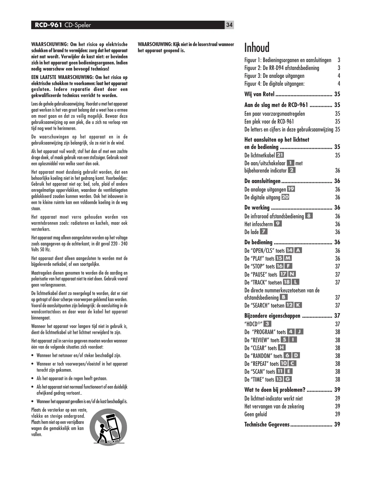 WAARSCHUWING: Kijk niet in de laserstraal wanneer het apparaat geopend is. Inhoud Figuur 1: Bedieningsorganen en aansluitingen Figuur 2: De RR-D94 afstandsbediening Figuur 3: De analoge uitgangen Figuur 4: De digitale uitgangen: