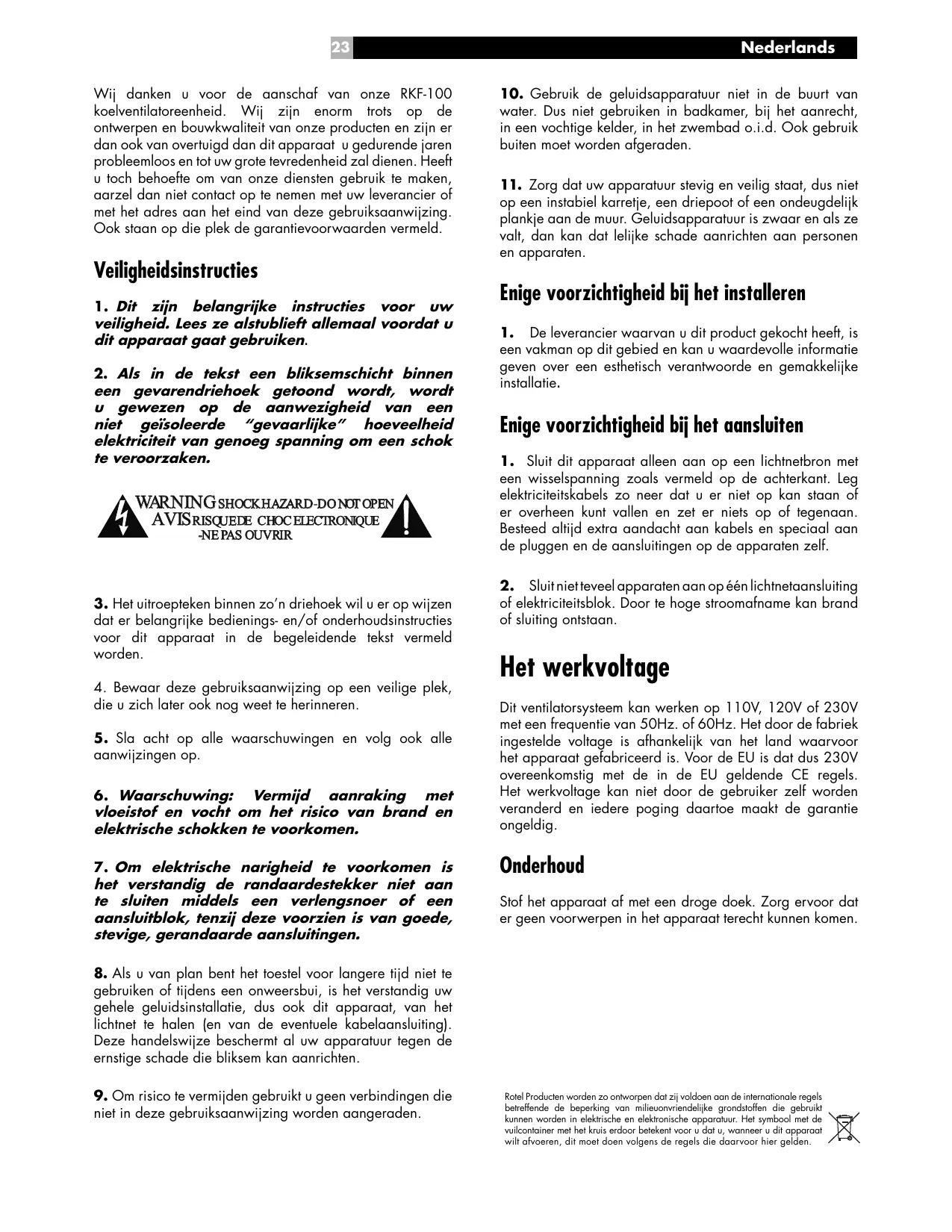 Wij danken u voor de aanschaf van onze RKF-100 koelventilatoreenheid. Wij zijn enorm trots op de ontwerpen en bouwkwaliteit van onze producten en zijn er dan ook van overtuigd dan dit apparaat u gedurende jaren probleemloos en tot uw grote tevredenheid zal dienen. Heeft u toch behoefte om van onze diensten gebruik te maken, aarzel dan niet contact op te nemen met uw leverancier of met het adres aan het eind van deze gebruiksaanwijzing. Ook staan op die plek de garantievoorwaarden vermeld. Veiligheidsinstructies