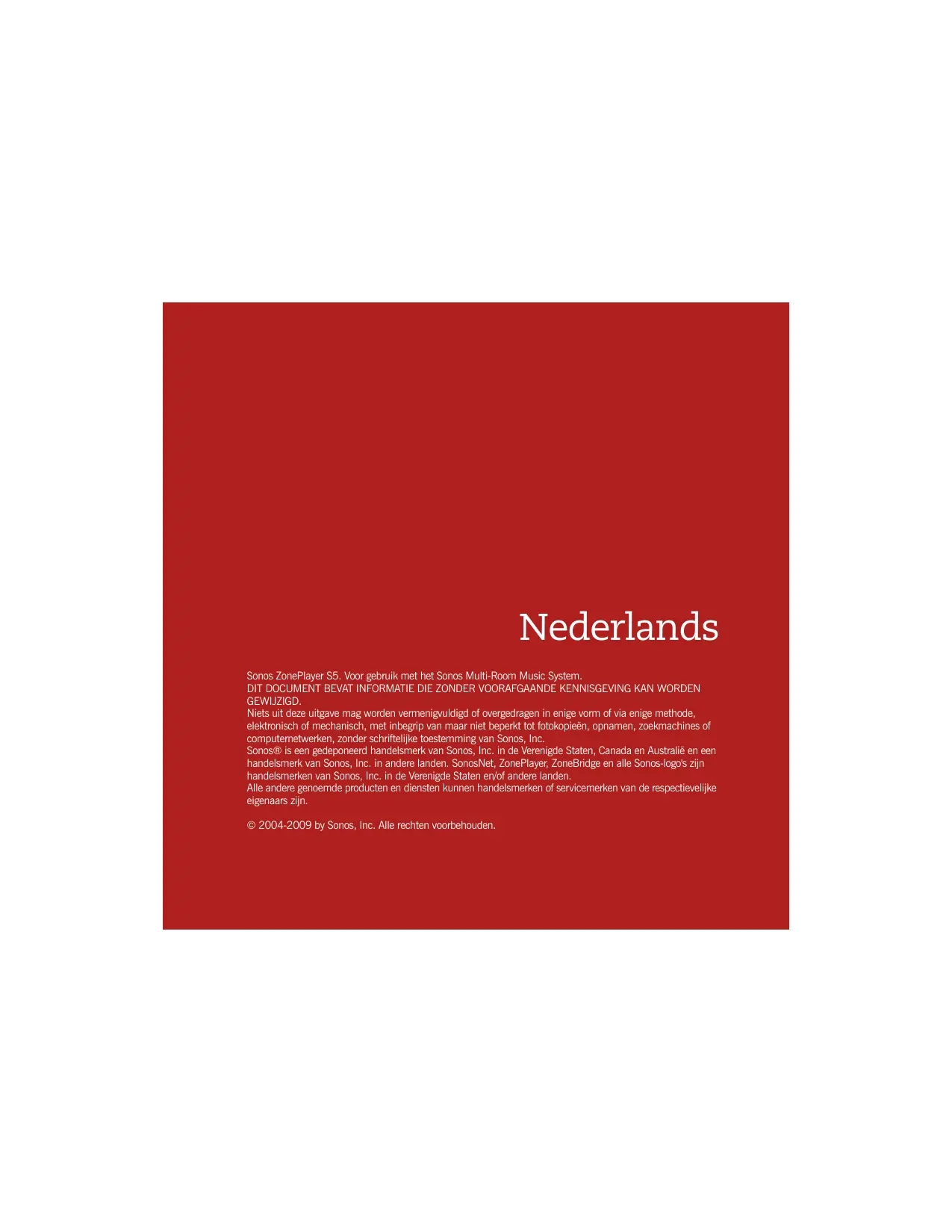 Zubehörprodukte. Nederlands Sonos ZonePlayer S5. Voor gebruik met het Sonos Multi-Room Music System. DIT DOCUMENT BEVAT INFORMATIE DIE ZONDER VOORAFGAANDE KENNISGEVING KAN WORDEN GEWIJZIGD. Niets uit deze uitgave mag worden vermenigvuldigd of overgedragen in enige vorm of via enige methode, elektronisch of mechanisch, met inbegrip van maar niet beperkt tot fotokopieën, opnamen, zoekmachines of computernetwerken, zonder schriftelijke toestemming van Sonos, Inc. Sonos® is een gedeponeerd handelsmerk van Sonos, Inc. in de Verenigde Staten, Canada en Australië en een handelsmerk van Sonos, Inc. in andere landen. SonosNet, ZonePlayer, ZoneBridge en alle Sonos-logo's zijn handelsmerken van Sonos, Inc. in de Verenigde Staten en/of andere landen. Alle andere genoemde producten en diensten kunnen handelsmerken of servicemerken van de respectievelijke eigenaars zijn. © 2004-2009 by Sonos, Inc. Alle rechten voorbehouden. NEDERLANDS DUITS NEDERLANDS