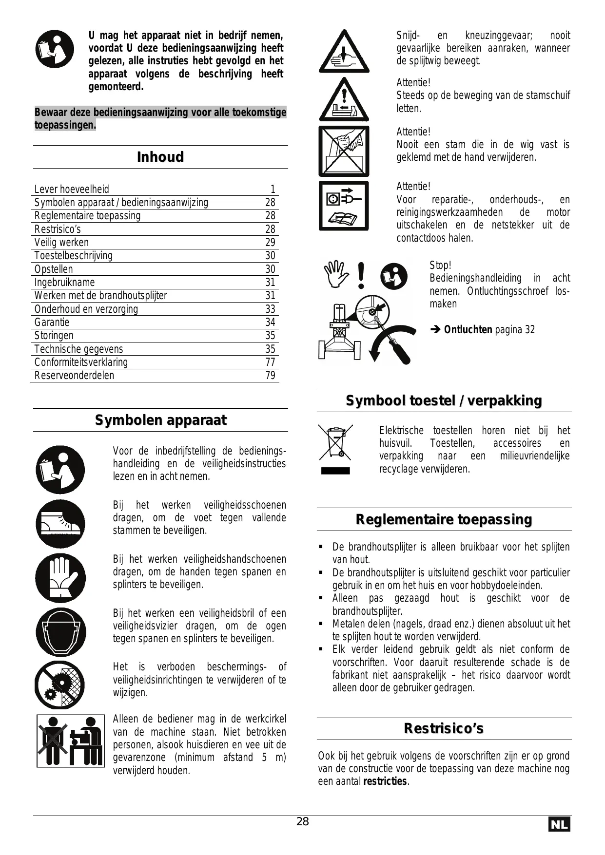 Stop! Bedieningshandleiding in acht nemen. Ontluchtingsschroef losmaken Î Ontluchten pagina 32 Symbool toestel / verpakking Symbolen apparaat Elektrische toestellen horen niet bij het huisvuil. Toestellen, accessoires verpakking naar een milieuvriendelijke recyclage verwijderen. Voor de inbedrijfstelling de bedieningshandleiding en de veiligheidsinstructies lezen en in acht nemen. Bij het werken veiligheidsschoenen dragen, om de voet tegen vallende stammen te beveiligen. Reglementaire toepassing De brandhoutsplijter is alleen bruikbaar voor het splijten van hout. De brandhoutsplijter is uitsluitend geschikt voor particulier gebruik in en om het huis en voor hobbydoeleinden. Alleen pas gezaagd hout is geschikt voor de brandhoutsplijter. Metalen delen (nagels, draad enz.) dienen absoluut uit het te splijten hout te worden verwijderd. Elk verder leidend gebruik geldt als niet conform de voorschriften. Voor daaruit resulterende schade is de fabrikant niet aansprakelijk – het risico daarvoor wordt alleen door de gebruiker gedragen. Bij het werken veiligheidshandschoenen dragen, om de handen tegen spanen en splinters te beveiligen. Bij het werken een veiligheidsbril of een veiligheidsvizier dragen, om de ogen tegen spanen en splinters te beveiligen. Het is verboden beschermings- of veiligheidsinrichtingen te verwijderen of te wijzigen. Alleen de bediener mag in de werkcirkel van de machine staan. Niet betrokken personen, alsook huisdieren en vee uit de gevarenzone (minimum afstand 5 m) verwijderd houden. Restrisico’s Ook bij het gebruik volgens de voorschriften zijn er op grond van de constructie voor de toepassing van deze machine nog een aantal restricties.