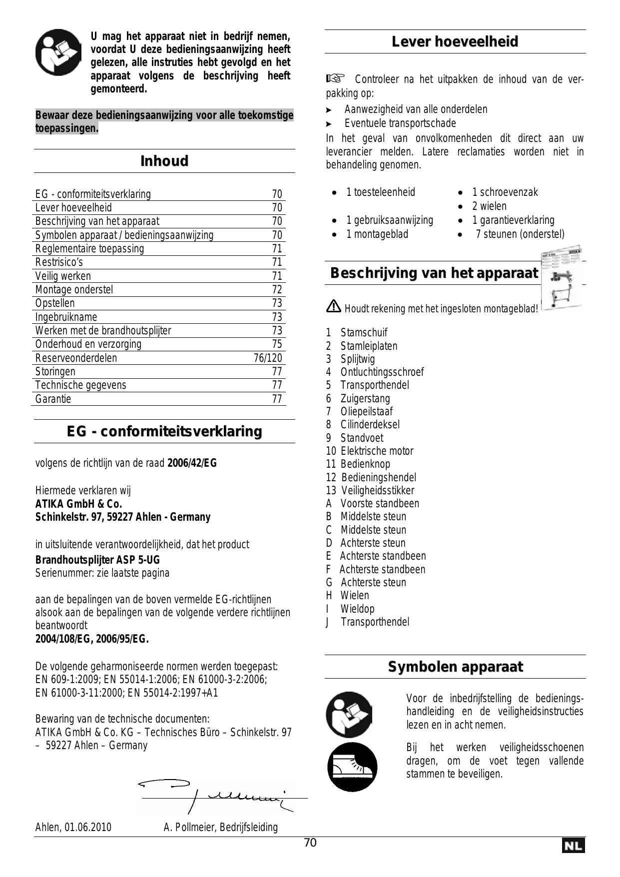 - 1 montageblad Beschrijving van het apparaat Houdt rekening met het ingesloten montageblad! 1 Stamschuif 2 Stamleiplaten 3 Splijtwig 4 Ontluchtingsschroef 5 Transporthendel 6 Zuigerstang 7 Oliepeilstaaf 8 Cilinderdeksel 9 Standvoet 10 Elektrische motor 11 Bedienknop 12 Bedieningshendel 13 Veiligheidsstikker A Voorste standbeen B Middelste steun C Middelste steun D Achterste steun E Achterste standbeen F Achterste standbeen G Achterste steun H Wielen I Wieldop J Transporthendel EG - conformiteitsverklaring volgens de richtlijn van de raad 2006/42/EG Hiermede verklaren wij ATIKA GmbH & Co. Schinkelstr. 97, 59227 Ahlen - Germany in uitsluitende verantwoordelijkheid, dat het product Brandhoutsplijter ASP 5-UG Serienummer: zie laatste pagina aan de bepalingen van de boven vermelde EG-richtlijnen alsook aan de bepalingen van de volgende verdere richtlijnen beantwoordt 2004/108/EG, 2006/95/EG. De volgende geharmoniseerde normen werden toegepast: EN 609-1:2009; EN 55014-1:2006; EN 61000-3-2:2006; EN 61000-3-11:2000; EN 55014-2:1997+A1 Symbolen apparaat Voor de inbedrijfstelling de bedieningshandleiding en de veiligheidsinstructies lezen en in acht nemen. Bewaring van de technische documenten: ATIKA GmbH & Co. KG – Technisches Büro – Schinkelstr. 97 – 59227 Ahlen – Germany Ahlen, 01.06.2010