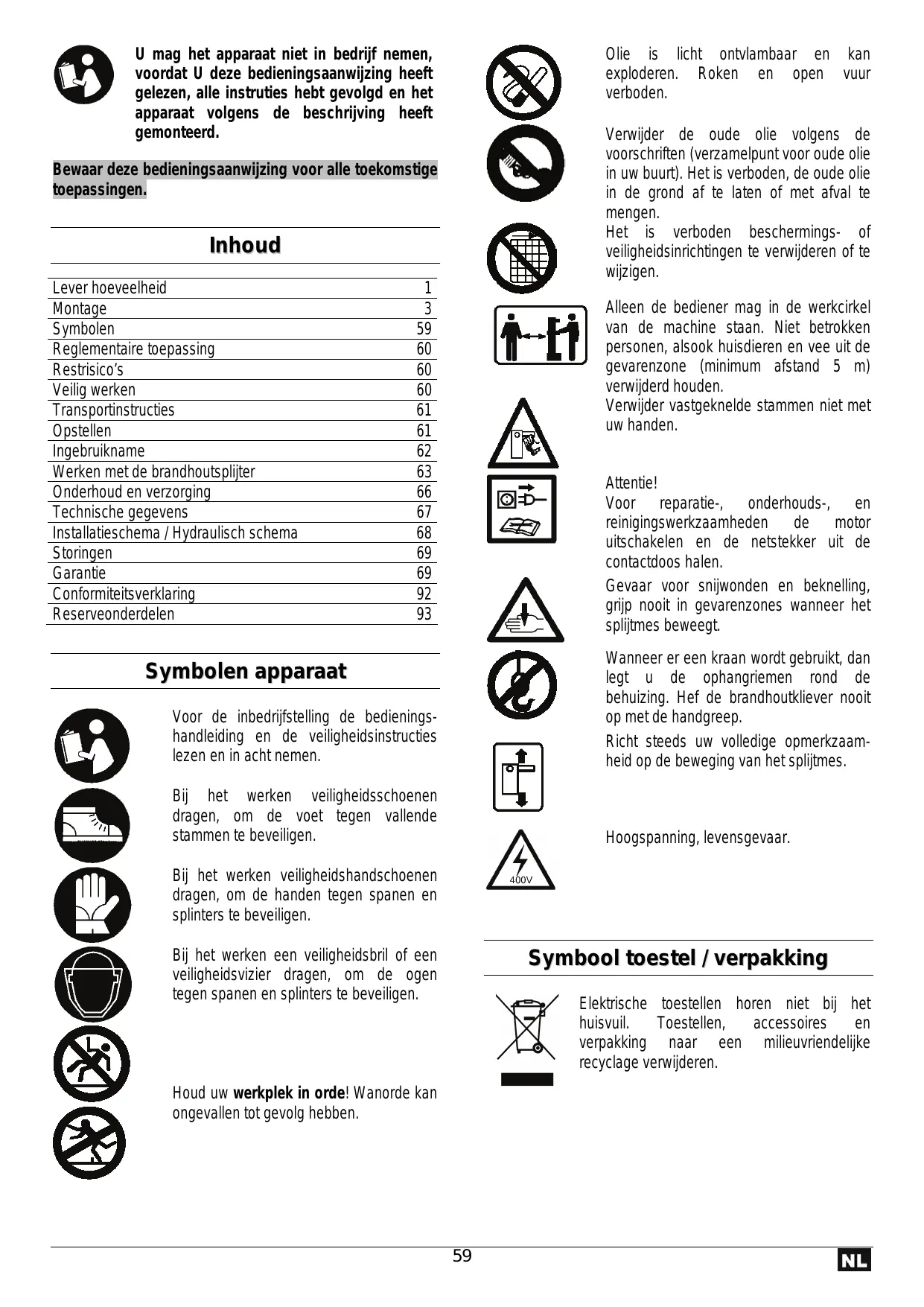 U mag het apparaat niet in bedrijf nemen, voordat U deze bedieningsaanwijzing heeft gelezen, alle instruties hebt gevolgd en het apparaat volgens de beschrijving heeft gemonteerd. Olie is licht ontvlambaar en kan exploderen. Roken en open vuur verboden. Verwijder de oude olie volgens de voorschriften (verzamelpunt voor oude olie in uw buurt). Het is verboden, de oude olie in de grond af te laten of met afval te mengen. Het is verboden beschermings- of veiligheidsinrichtingen te verwijderen of te wijzigen. Bewaar deze bedieningsaanwijzing voor alle toekomstige toepassingen. Inhoud Lever hoeveelheid Montage Symbolen Reglementaire toepassing Restrisico’s Veilig werken Transportinstructies Opstellen Ingebruikname Werken met de brandhoutsplijter Onderhoud en verzorging Technische gegevens Installatieschema / Hydraulisch schema Storingen Garantie Conformiteitsverklaring Reserveonderdelen