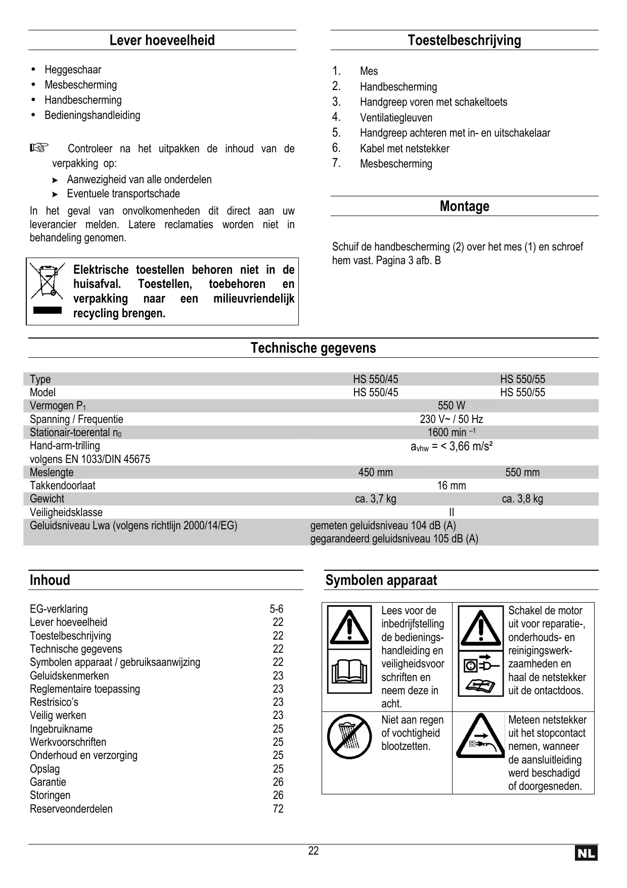 gemeten geluidsniveau 104 dB (A) gegarandeerd geluidsniveau 105 dB (A) Inhoud EG-verklaring Lever hoeveelheid Toestelbeschrijving Technische gegevens Symbolen apparaat / gebruiksaanwijzing Geluidskenmerken Reglementaire toepassing Restrisico’s Veilig werken Ingebruikname Werkvoorschriften Onderhoud en verzorging Opslag Garantie Storingen Reserveonderdelen HS 550/55 HS 550/55 Symbolen apparaat 5-6