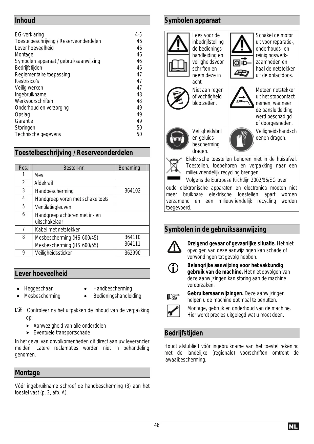 Controleer na het uitpakken de inhoud van de verpakking op: ! Aanwezigheid van alle onderdelen ! Eventuele transportschade Dreigend gevaar of gevaarlijke situatie. Het niet opvolgen van deze aanwijzingen kan schade of verwondingen tot gevolg hebben. Belangrijke aanwijzing voor het vakkundig gebruik van de machine. Het niet opvolgen van deze aanwijzingen kan storing aan de machine veroorzaken. Gebruikersaanwijzingen. Deze aanwijzingen helpen u de machine optimaal te benutten. Montage, gebruik en onderhoud van de machine. Hier wordt precies uitgelegd wat u moet doen. Bedrijfstijden In het geval van onvolkomenheden dit direct aan uw leverancier melden. Latere reclamaties worden niet in behandeling genomen. Houdt alstublieft vóór ingebruikname van het toestel rekening met de landelijke (regionale) voorschriften omtrent de lawaaibescherming. Montage Vóór ingebruikname schroef de handbescherming (3) aan het toestel vast (p. 2, afb. A).
