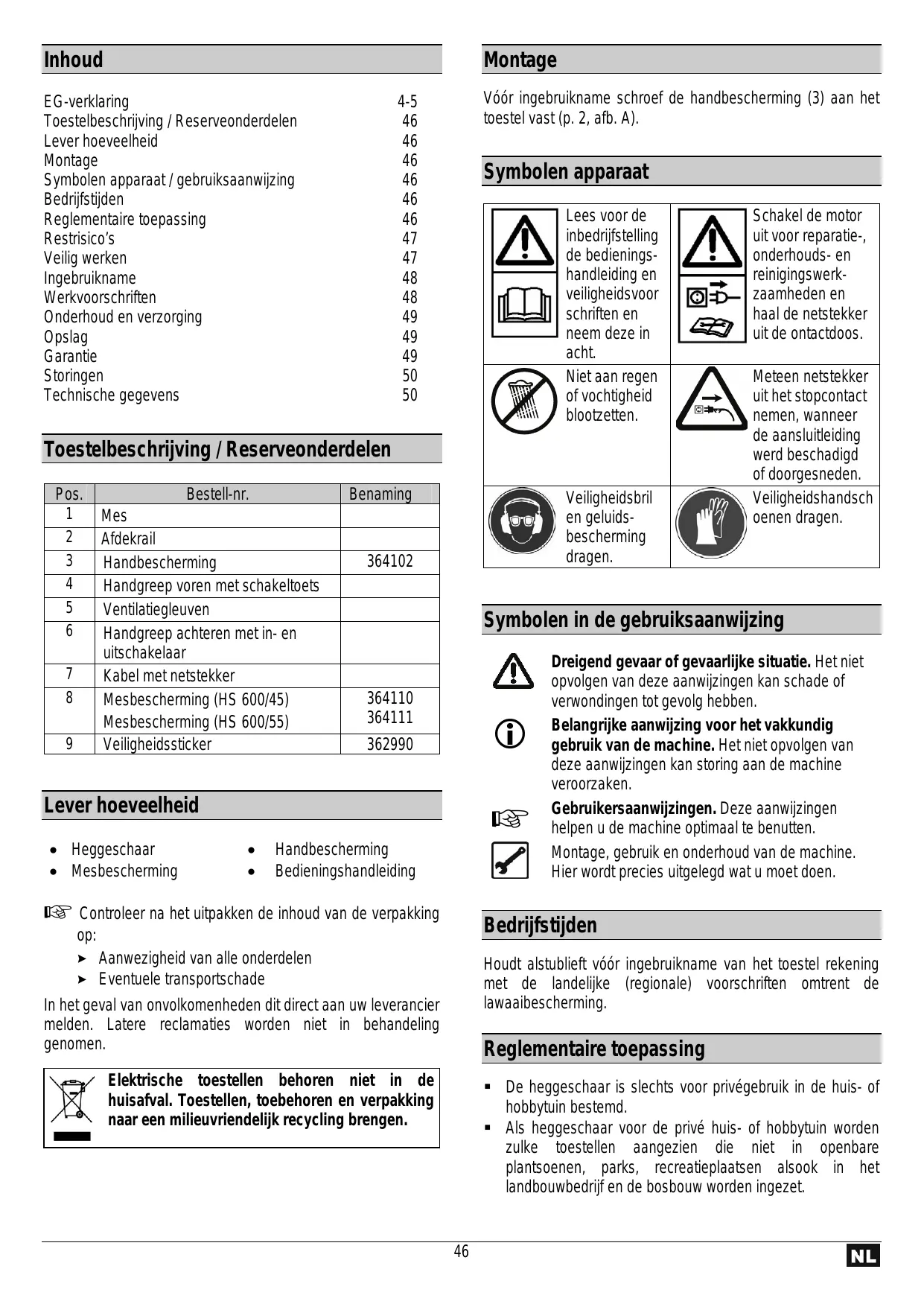 EG-verklaring Toestelbeschrijving / Reserveonderdelen Lever hoeveelheid Montage Symbolen apparaat / gebruiksaanwijzing Bedrijfstijden Reglementaire toepassing Restrisico’s Veilig werken Ingebruikname Werkvoorschriften Onderhoud en verzorging Opslag Garantie Storingen Technische gegevens