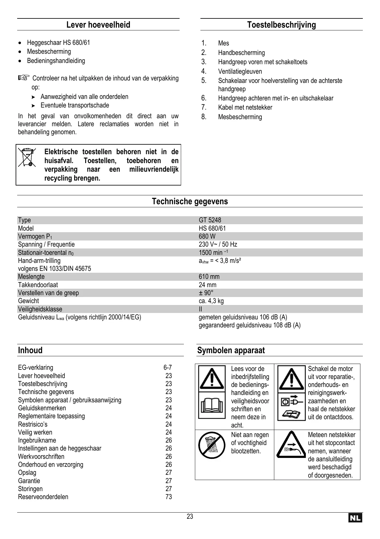 GT 5248 HS 680/61 680 W 230 V~ / 50 Hz 1500 min –1 avhw = < 3,8 m/s² 610 mm 24 mm ± 90° ca. 4,3 kg II gemeten geluidsniveau 106 dB (A) gegarandeerd geluidsniveau 108 dB (A)
