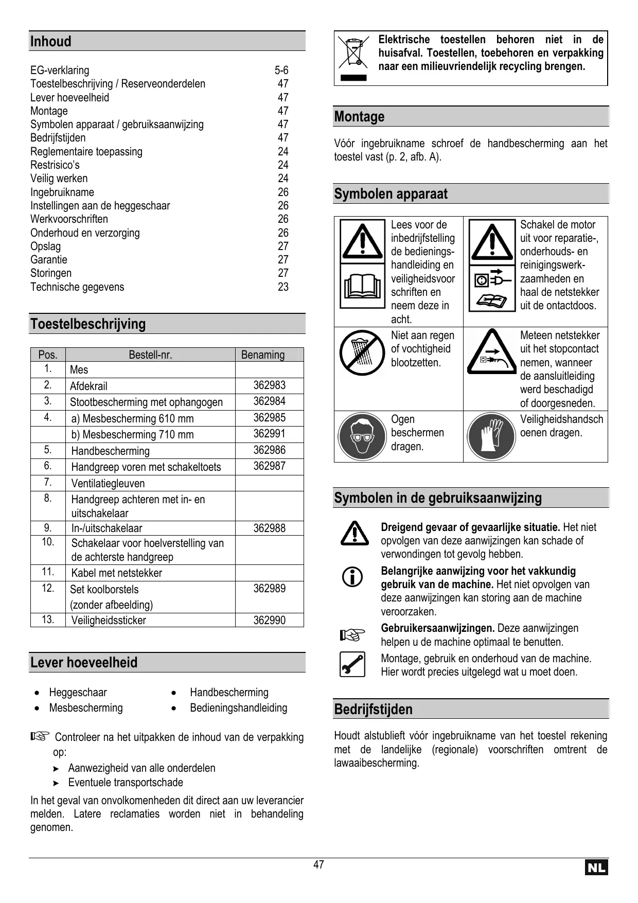 Elektrische toestellen behoren niet in de huisafval. Toestellen, toebehoren en verpakking naar een milieuvriendelijk recycling brengen. Inhoud EG-verklaring Toestelbeschrijving / Reserveonderdelen Lever hoeveelheid Montage Symbolen apparaat / gebruiksaanwijzing Bedrijfstijden Reglementaire toepassing Restrisico’s Veilig werken Ingebruikname Instellingen aan de heggeschaar Werkvoorschriften Onderhoud en verzorging Opslag Garantie Storingen Technische gegevens 5-6