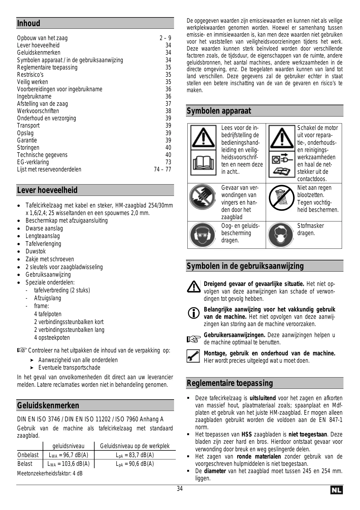 - Deze tafecirkelzaag is uitsluitend voor het zagen en afkanten van massief hout,plaatmaterial zoals; spanplaat en Mdfplaten et gebruik van het juiste HM-zaagblad. Ermighten alleen zaagbladen gebruikt worden die voldoen aan de EN 847-1 norm.