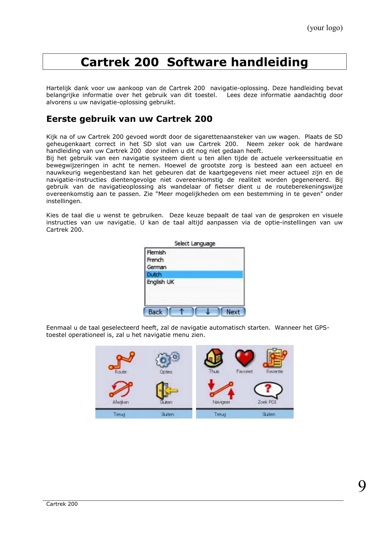 Cartrek 200 (your logo) Cartrek 200 Software handleiding Hartelijk dank voor uw aankoop van de Cartrek 200 navigatie-oplossing. Deze handleiding bevat belangrijke informatie over het gebruik van dit toestel. Lees deze informatie aandachtig door alvorens u uw navigatie-oplossing gebruikt. Eerste gebruik van uw Cartrek 200 Kijk na of uw Cartrek 200 gevoed wordt door de sigarettenaansteker van uw wagen. Plaats de SD geheugenkaart correct in het SD slot van uw Cartrek 200. Neem zeker ook de hardware handleiding van uw Cartrek 200 door indien u dit nog niet gedaan heeft. Bij het gebruik van een navigatie systeem dient u ten allen tijde de actuele verkeerssituatie en bewegwijzeringen in acht te nemen. Hoewel de grootste zorg is besteed aan een actueel en nauwkeurig wegenbestand kan het gebeuren dat de kaartgegevens niet meer actueel zijn en de navigatie-instructies dientengevolge niet overeenkomstig de realiteit worden gegenereerd. Bij gebruik van de navigatieoplossing als wandelaar of fietser dient u de routeberekeningswijze overeenkomstig aan te passen. Zie "Meer mogelijkheden om een bestemming in te geven" onder instellingen. Kies de taal die u wenst te gebruiken. Deze keuze bepaalt de taal van de gesproken en visuele instructies van uw navigatie. U kan de taal altijd aanpassen via de optie-instellingen van uw Cartrek 200. Eenmaal u de taal geselecteerd heeft, zal de navigatie automatisch starten. Wanneer het GPStoestel operationeel is, zal u het navigatie menu zien.