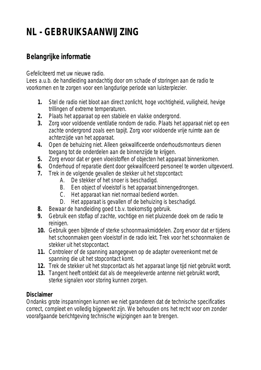 Belangrijke informatie Gefeliciteerd met uw nieuwe radio. Lees a.u.b. de handleiding aandachtig door om schade of storingen aan de radio te voorkomen en te zorgen voor een langdurige periode van luisterplezier.