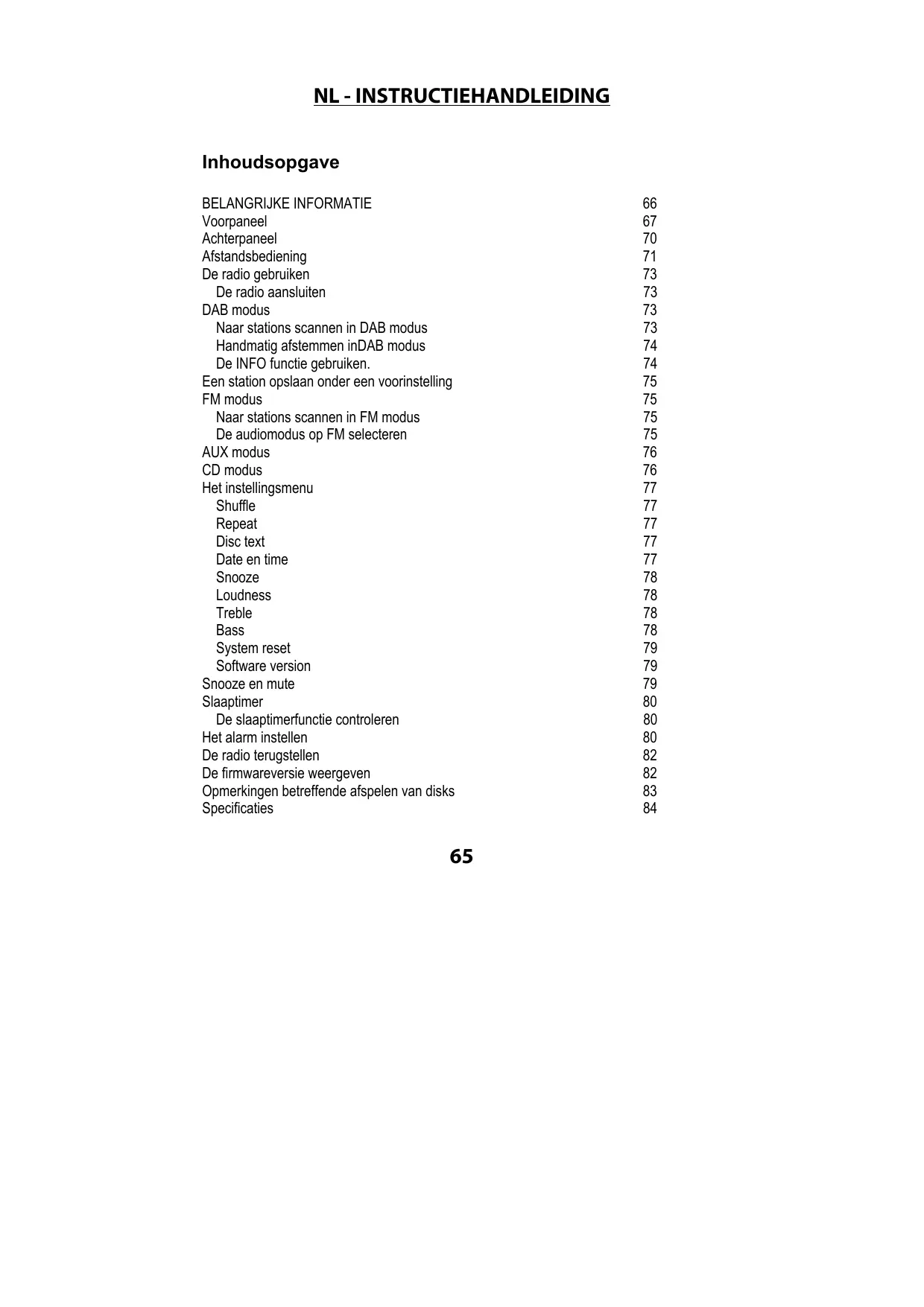 Inhoudsopgave BELANGRIJKE INFORMATIE Voorpaneel Achterpaneel Afstandsbediening De radio gebruiken De radio aansluiten DAB modus Naar stations scannen in DAB modus Handmatig afstemmen inDAB modus De INFO functie gebruiken. Een station opslaan onder een voorinstelling FM modus Naar stations scannen in FM modus De audiomodus op FM selecteren AUX modus CD modus Het instellingsmenu Shuffle Repeat Disc text Date en time Snooze Loudness Treble Bass System reset Software version Snooze en mute Slaaptimer De slaaptimerfunctie controleren Het alarm instellen De radio terugstellen De firmwareversie weergeven Opmerkingen betreffende afspelen van disks Specificaties
