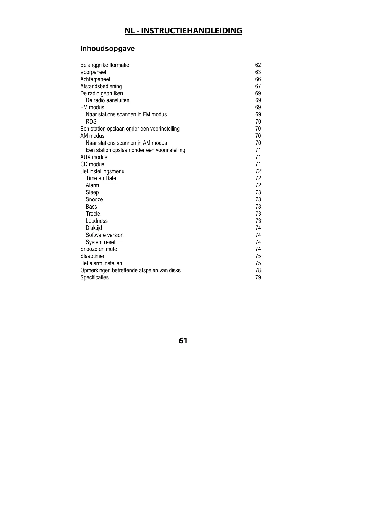 Inhoudsopgave Belanggrijke Iformatie Voorpaneel Achterpaneel Afstandsbediening De radio gebruiken De radio aansluiten FM modus Naar stations scannen in FM modus RDS Een station opslaan onder een voorinstelling AM modus Naar stations scannen in AM modus Een station opslaan onder een voorinstelling AUX modus CD modus Het instellingsmenu Time en Date Alarm Sleep Snooze Bass Treble Loudness Disktijd Software version System reset Snooze en mute Slaaptimer Het alarm instellen Opmerkingen betreffende afspelen van disks Specificaties