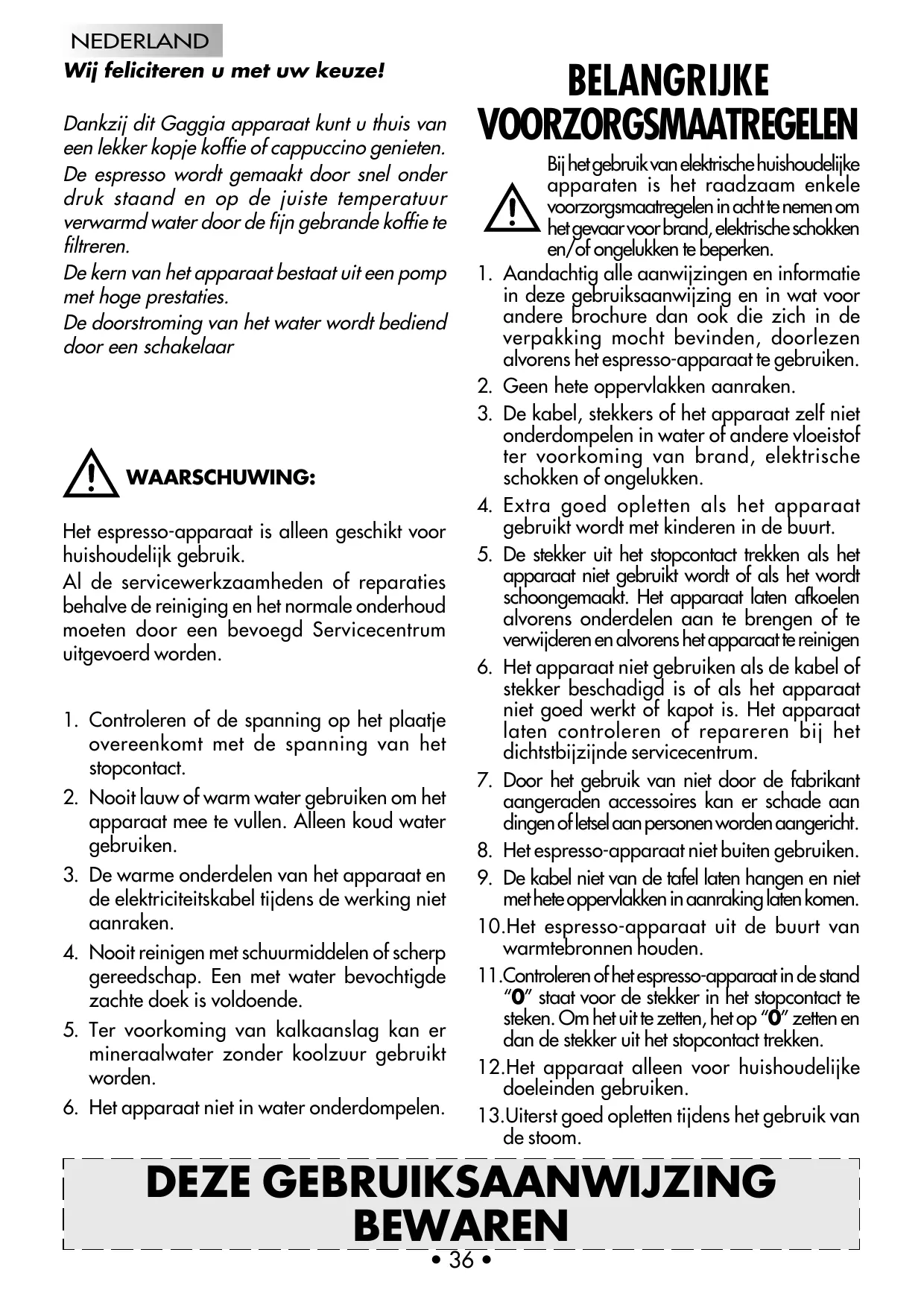 La machine Gaggia est maintenant prête. REMARQUE: Il est possible que l’amorçage automatique de la pompe ne fonctionne pas momentanément, à cause de la «bulle d’air». Au cas où l’eau ne descendrait pas de l’élément percolateur: a) Placez un petit pot à lait ou une tasse sous le bec à vapeur Turbo (8). b) Tournez le bouton (7) au sommet de l’appareil dans le sens contraire des aiguilles d’une montre, pour ouvrir la valve vapeur/ eau chaude et actionnez l’interrupteur vapeur (4) et l’interrupteur café/eau chaude jusqu’à la position “1” pour activer la pompe. c) Au bout de quelques secondes, un jet d’eau régulier sortira du bec à vapeur. Laissez couler environ une tasse d’eau. Puis fermez la valve vapeur/eau chaude et fermez l’interrupteur café/ eau chaude et l’interrupteur vapeur (4) sur la position “0”. La machine Gaggia est maintenant prête. d) NOTE: Le voyant de température (3) clignote pendant que l’eau chauffe. Il s’allume automatiquement lorsqu’elle a atteint la bonne température pour le café (et la vapeur). Après avoir allumé la machine, pour obtenir le premier café, attendez environ 6 minutes pour un chauffage idéal, alors que pour les suivants, la machine sera toujours prête. La machine se caractérise également par le système antigoutte qui élimine la plupart du liquide s’égouttant du groupe de distribution (14). Lorsque le café s’est écoulé, il peut se produire un léger égouttement à cause du marc de café mouillé contenu dans le portefiltre. ATTENTION: Ne jamais mettre la machine en marche lorsque le réservoir est vide, afin d’éviter d’endommager la pompe. Une utilisation incorrecte n’est pas couverte par la garantie.