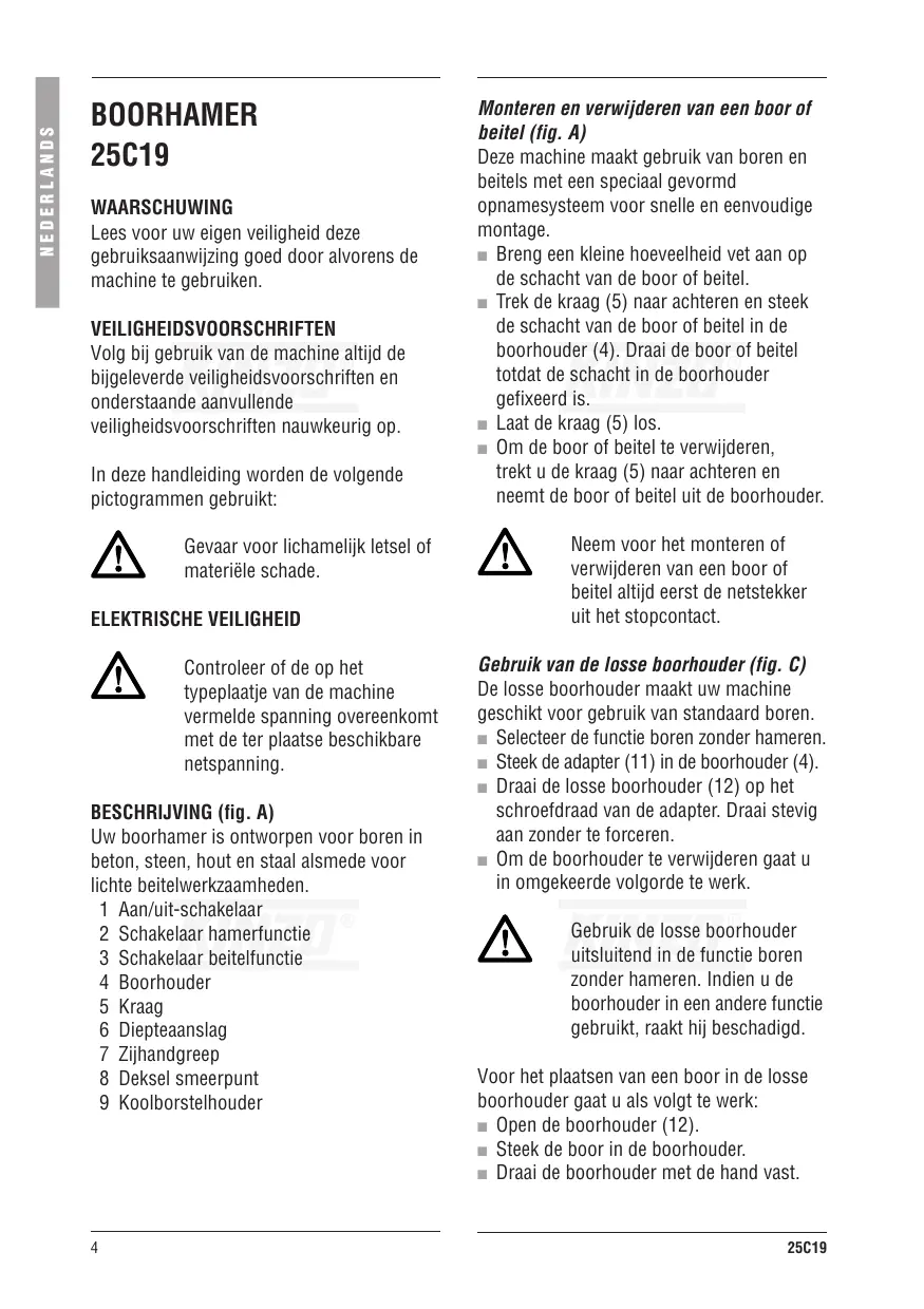 NEDERLANDS BOORHAMER 25C19 WAARSCHUWING Lees voor uw eigen veiligheid deze gebruiksaanwijzing goed door alvorens de machine te gebruiken. VEILIGHEIDSVOORSCHRIFTEN Volg bij gebruik van de machine altijd de bijgeleverde veiligheidsvoorschriften en onderstaande aanvullende veiligheidsvoorschriften nauwkeurig op. In deze handleiding worden de volgende pictogrammen gebruikt: Gevaar voor lichamelijk letsel of materiële schade. ELEKTRISCHE VEILIGHEID Controleer of de op het typeplaatje van de machine vermelde spanning overeenkomt met de ter plaatse beschikbare netspanning. BESCHRIJVING (fig. A) Uw boorhamer is ontworpen voor boren in beton, steen, hout en staal alsmede voor lichte beitelwerkzaamheden. 1 Aan/uit-schakelaar 2 Schakelaar hamerfunctie 3 Schakelaar beitelfunctie 4 Boorhouder 5 Kraag 6 Diepteaanslag 7 Zijhandgreep 8 Deksel smeerpunt 9 Koolborstelhouder