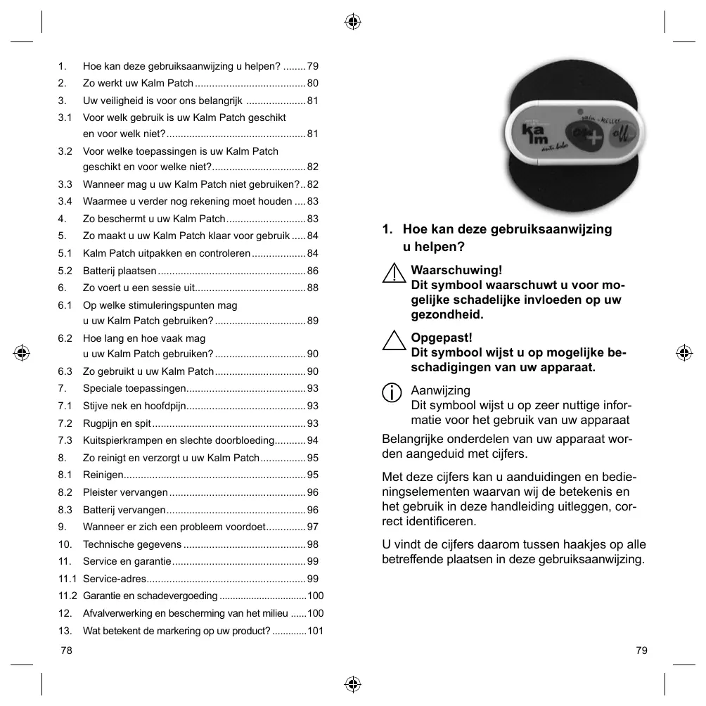 3. Uw veiligheid is voor ons belangrijk Leest u a.u.b. deze gebruiksaanwijzing aandachtig door, vóór u uw Kalm Patch de eerste keer gebruikt. Er staat alles in wat u moet weten om uw Kalm Patch veilig te gebruiken en letsels te vermijden. Deze gebruiksaanwijzing maakt deel uit van uw apparaat. Bewaar deze gebruiksaanwijzing zorgvuldig, tot op het ogenblik dat u uw Kalm Patch ofwel samen met deze gebruiksaanwijzing aan een nieuwe eigenaar doorgeeft ofwel tot u uw Kalm Patch voor recycling afvoert.