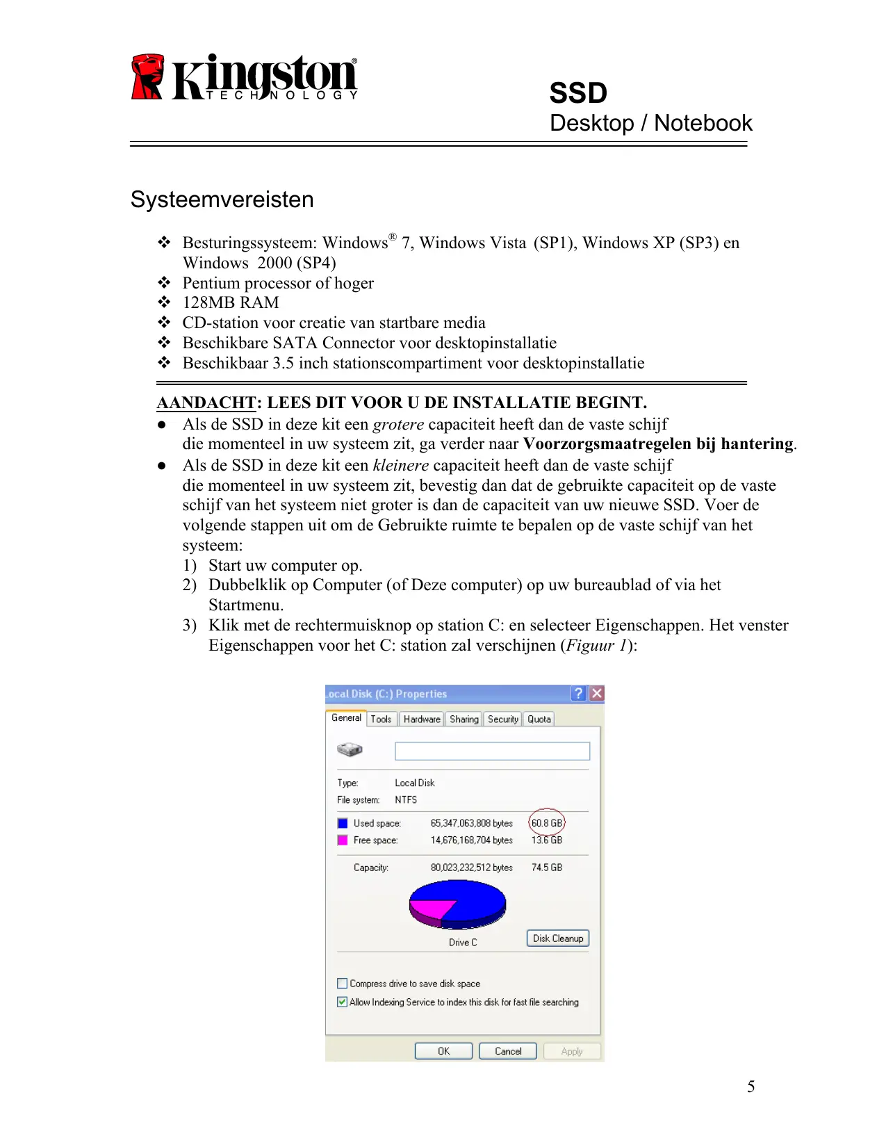 SSD Desktop / Notebook Systeemvereisten Besturingssysteem: Windows® 7, Windows Vista (SP1), Windows XP (SP3) en Windows 2000 (SP4) Pentium processor of hoger 128MB RAM CD-station voor creatie van startbare media Beschikbare SATA Connector voor desktopinstallatie Beschikbaar 3.5 inch stationscompartiment voor desktopinstallatie AANDACHT: LEES DIT VOOR U DE INSTALLATIE BEGINT. ● Als de SSD in deze kit een grotere capaciteit heeft dan de vaste schijf die momenteel in uw systeem zit, ga verder naar Voorzorgsmaatregelen bij hantering. ● Als de SSD in deze kit een kleinere capaciteit heeft dan de vaste schijf die momenteel in uw systeem zit, bevestig dan dat de gebruikte capaciteit op de vaste schijf van het systeem niet groter is dan de capaciteit van uw nieuwe SSD. Voer de volgende stappen uit om de Gebruikte ruimte te bepalen op de vaste schijf van het systeem: 1) Start uw computer op. 2) Dubbelklik op Computer (of Deze computer) op uw bureaublad of via het Startmenu. 3) Klik met de rechtermuisknop op station C: en selecteer Eigenschappen. Het venster Eigenschappen voor het C: station zal verschijnen (Figuur 1):