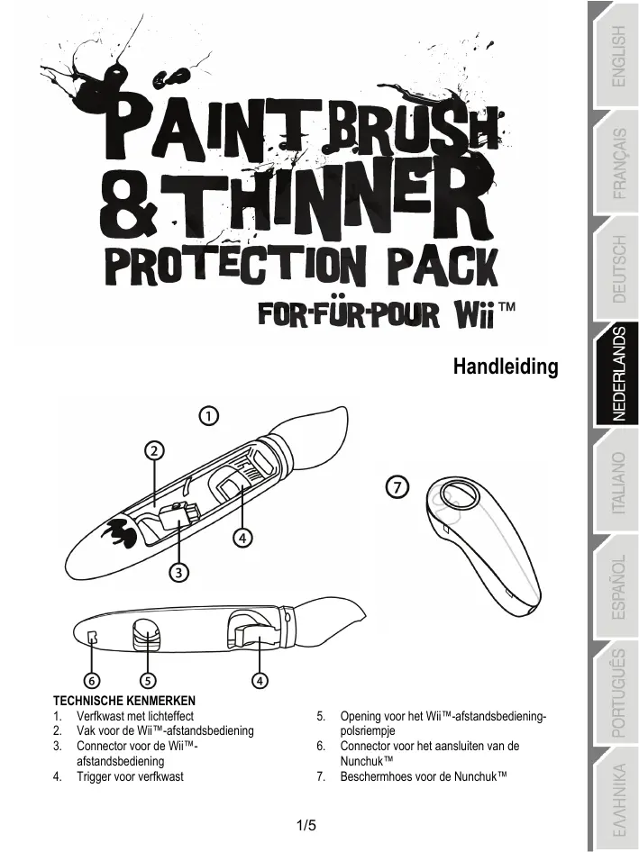 1/5 Opening voor het Wii™-afstandsbedieningpolsriempje Connector voor het aansluiten van de Nunchuk™ Beschermhoes voor de Nunchuk™ DE WII™-AFSTANDSBEDIENING IN HET VAK PLAATSEN Druk nooit op verfkwasttrigger (4) als de Wii™-afstandsbediening er niet in zit: doet u dit toch,dan kan het product beschadigen. - Sluit de Wii™-afstandsbediening aan op de connector (3). - Steek het polsriempje door de opening (5) en plaats de Wii™-afstandsbediening in het vak (2). - De “haren” bovenop de verfkwast lichten op als u op de verfkwasttrigger (4) duwt. Opmerkingen: De verfkwast geeft alleen licht als de Wii™-afstandsbediening is aangesloten op de connector (3). Omdat de verfkwast zijn voeding uit de connector (3) voor de Wii™-afstandsbediening haalt, zijn er geen batterijen nodig behalve de eigen batterijen van de Wii™-afstandsbediening. 2/5 DE BESCHERMHOES INSTALLEREN EN DE NUNCHUK™ AANSLUITEN OP DE WII™AFSTANDSBEDIENING - Klik de twee helften van de beschermhoes vast over de Nunchuk™. - Sluit de Nunchuk™ aan op de Wii™-afstandsbediening door de Nunchuk™-connector aan te sluiten op de Nunchuk™-connector (6) in de verfkwast. Nu kan er gespeeld worden! 3/5 TECHNISCHE ONDERSTEUNING Mocht u problemen ondervinden met dit product, ga dan naar http://ts.thrustmaster.com en klik op Technical Support. U hebt daar toegang tot verschillende onderwerpen die u helpen bij het vinden van oplossingen, zoals de FAQ (veelgestelde vragen) en de meest recente drivers en software. Als het probleem op die manier niet kan worden verholpen, kunt u contact opnemen met de Thrustmaster product technical support service (Technical Support). Per e-mail: Voordat u gebruik kunt maken van technische ondersteuning per e-mail dient u zich eerst online te registreren. Met de door u verstrekte informatie kan uw probleem sneller en beter worden opgelost. Klik op Registration aan de linkerzijde van de pagina Technical Support en volg de aanwijzingen op het scherm. Indien u reeds geregistreerd bent, vult u de velden Username en Password in en klikt u op Login. Per telefoon: Van maandag t/m vrijdag van 13:00 tot 17:00 en van 18:00 tot 22:00 (Nederlands) Van maandag t/m vrijdag van 13:00 tot 17:00 en van 18:00 tot 22:00 Belgïe Zaterdag van 9:00 tot 13:00 en van 14:00 tot 20:00 Kosten van interlokaal gesprek Zondag van 10:00 tot 13:00 en van 14:00 tot 17:00 (Engels) Van maandag t/m vrijdag van 13:00 tot 17:00 en van 18:00 tot 22:00 (Nederlands) Van maandag t/m vrijdag van 13:00 tot 17:00 en van 18:00 tot 22:00 Nederland Zaterdag van 9:00 tot 13:00 en van 14:00 tot 20:00 Kosten van lokaal gesprek Zondag van 10:00 tot 13:00 en van 14:00 tot 17:00 (Engels)