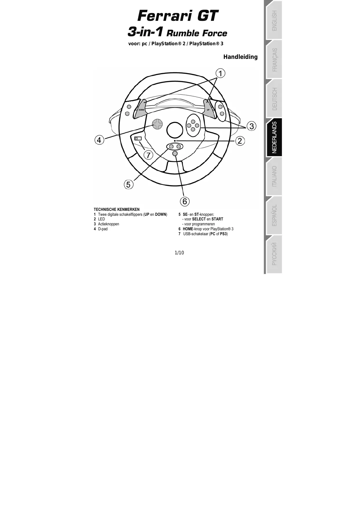 - Mijn stuur werkt niet correct (op pc of PS3) - Sluit de game af, koppel he stuur los, controleer of de PC/PS3 USB-schakelaar (7) in de goede stand staat, sluit alles opnieuw aan en probeer het nogmaals.