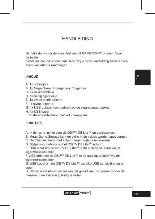 FUNCTIES A. In de tas is ruimte voor de DSi™/ DS Lite™ en accessoires. B. Mega Game Storage kunnen veilig in de vakjes worden opgeborgen. C. De folie beschermt het scherm tegen slijtage en krassen. D. Stylus voor gebruik op het DSi™/ DS Lite™ scherm. E. USB lader om de DSi™/ DS Lite™ in de auto op te laden via de sigarettenaansteker. F. USB lader om de DSi™/ DS Lite™ in de auto op te laden via de sigarettenaansteker. G. USB kabel om de DSi™/ DS Lite™ via elke USB aansluiting op te laden. H. Stereo oortelefoon: geniet van het geluid van uw games zonder de mensen in uw omgeving lastig te vallen.