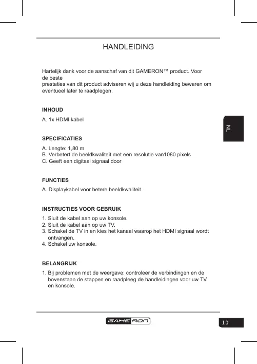 HANDLEIDING Hartelijk dank voor de aanschaf van dit GAMERON™ product. Voor de beste prestaties van dit product adviseren wij u deze handleiding bewaren om eventueel later te raadplegen. INHOUD A. 1x HDMI kabel