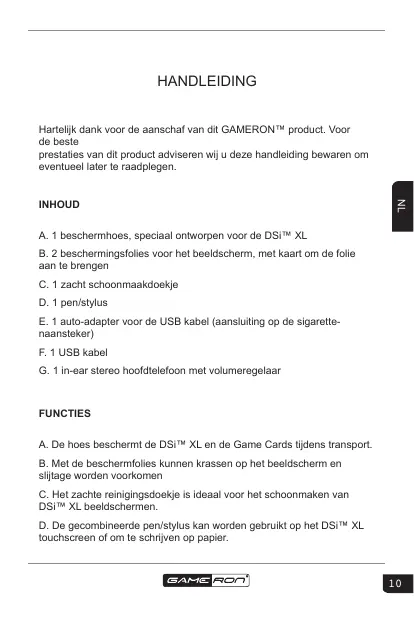 INHOUD A. 1 beschermhoes, speciaal ontworpen voor de DSi™ XL B. 2 beschermingsfolies voor het beeldscherm, met kaart om de folie aan te brengen C. 1 zacht schoonmaakdoekje D. 1 pen/stylus E. 1 auto-adapter voor de USB kabel (aansluiting op de sigarettenaansteker) F. 1 USB kabel G. 1 in-ear stereo hoofdtelefoon met volumeregelaar FUNCTIES A. De hoes beschermt de DSi™ XL en de Game Cards tijdens transport. B. Met de beschermfolies kunnen krassen op het beeldscherm en slijtage worden voorkomen C. Het zachte reinigingsdoekje is ideaal voor het schoonmaken van DSi™ XL beeldschermen. D. De gecombineerde pen/stylus kan worden gebruikt op het DSi™ XL touchscreen of om te schrijven op papier.