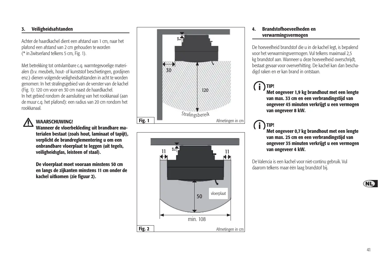 à la chaleur (par exemple, meubles, bois ou revêtements en plastique, rideaux, etc) : Dans la zone de rayonnement de la plaque de la cheminée (Fig. 1): 120 cm et 30 cm à côté de la cheminée. Dans la zone du raccordement du tuyau de combustion (sur le mur ou le plafond) : un rayon de 20 cm autour du tuyau d‘échappement.