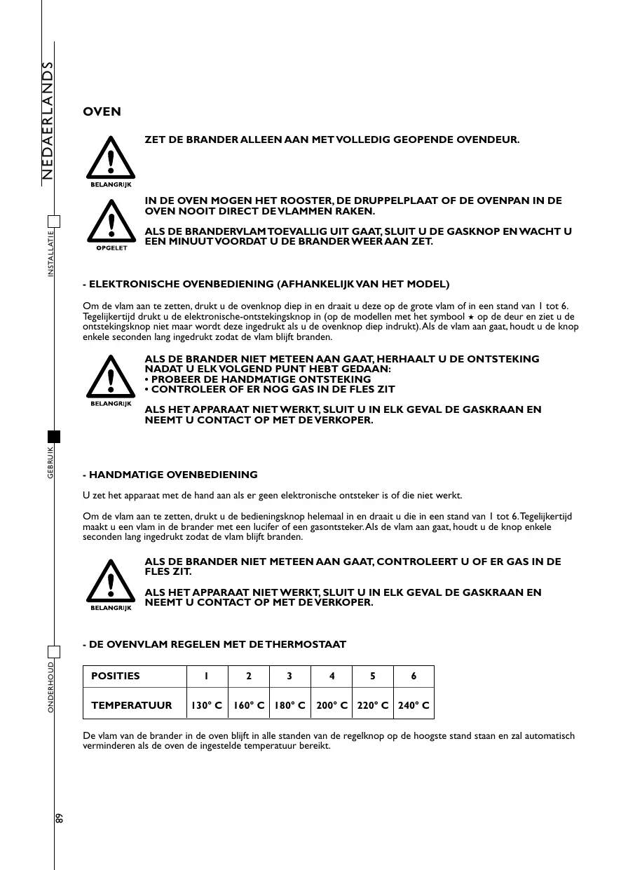 POSITIES 1 2 3 4 s 6 TEMPERATUUR |130° c | 160° c | 180° c | 200° c | 220° c |240°c De viam van de brander in de oven blif in alle standen van de regelknop op de hoogste stand staan en zal automatisch verminderen als de oven de ingestelde temperatuur bereikt.