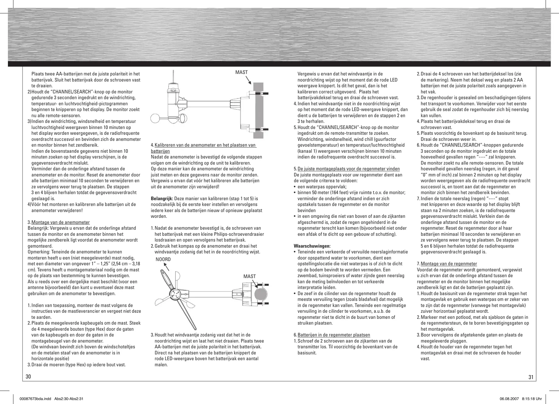 -richting, guurfactor (gevoelstemperatuur), dagelijks/ wekelijks/maandelijkse hoeveelheid regen, luchtdruk, weersvoorspelling, relatieve luchtvochtigheid binnen/ buiten, temperatuur, heat (opwarm) index en dauwpunt en tevens een radiogestuurde klok voorzien van alarmfunctie. Lees deze handleiding zorgvuldig door om alle kenmerken en functies van het nieuwe product te leren kennen. U treft in deze verpakking de volgende onderdelen aan: Belangrijk: Vergewis u ervan dat de onderlinge afstand tussen de monitor en de anemometer binnen het mogelijke zendbereik ligt voordat de anemometer wordt gemonteerd. Opmerking: Teneinde de anemometer te kunnen monteren heeft u een (niet meegeleverde) mast nodig, met een diameter van ongeveer 1” – 1,25” (2,54 cm – 3,18 cm). Tevens heeft u montagemateriaal nodig om de mast op de plaats van bestemming te kunnen bevestigen. Als u reeds over een dergelijke mast beschikt (voor een antenne bijvoorbeeld) dan kunt u eventueel deze mast gebruiken om de anemometer te bevestigen. 1. Indien van toepassing, monteer de mast volgens de instructies van de mastleverancier en vergeet niet deze te aarden. 2. Plaats de meegeleverde kapbeugels om de mast. Steek de 4 meegeleverde bouten (type Hex) door de gaten van de kapbeugels en door de gaten in de montagebeugel van de anemometer. (De windvaan bevindt zich boven de windschoteltjes en de metalen staaf van de anemometer is in horizontale positie) 3. Draai de moeren (type Hex) op iedere bout vast.